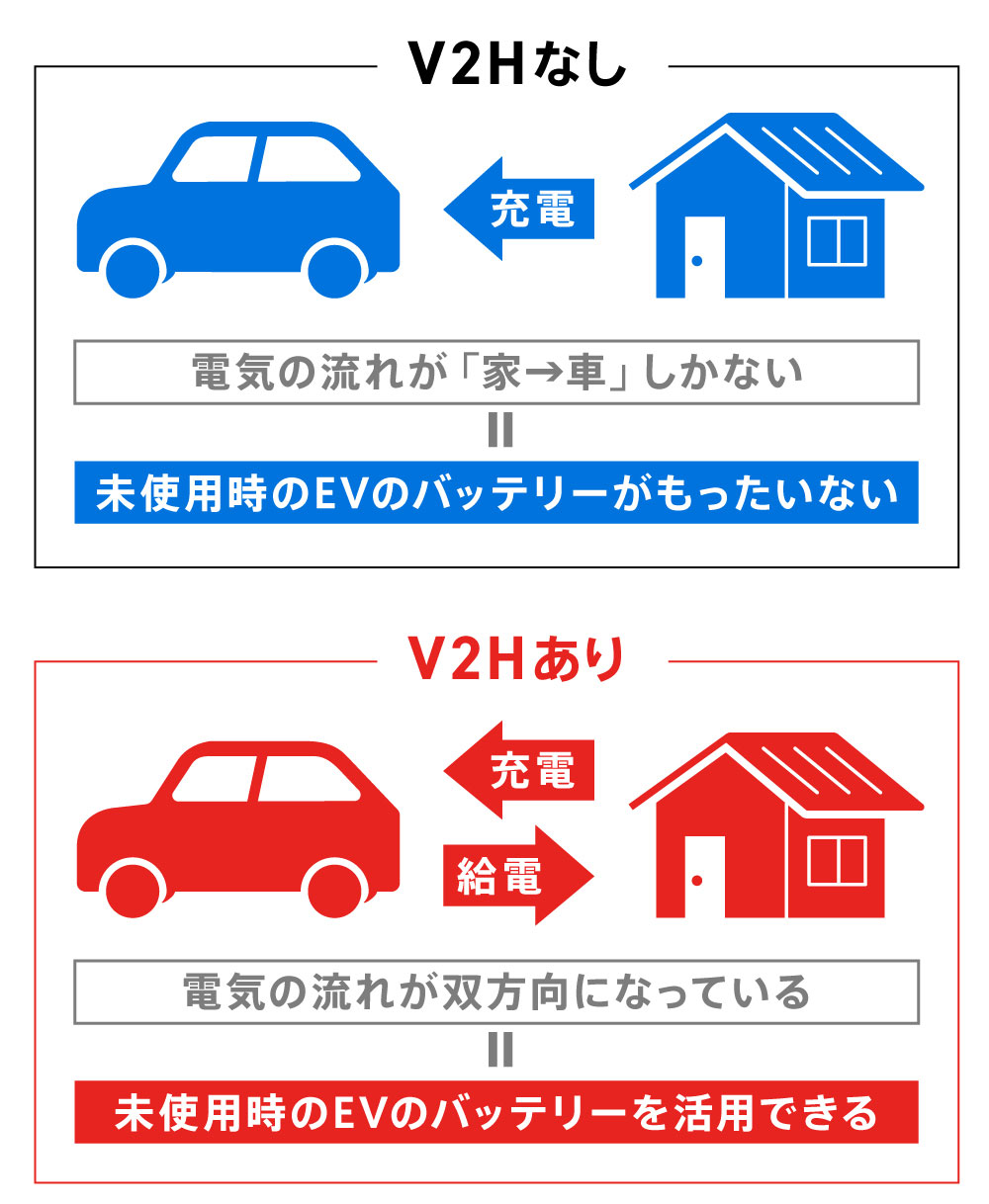 電気自動車の大容量バッテリーに、太陽光で発電した電気を蓄えておき、夜間に車から家に戻して活用するシステムです。車が走行していない時間に、バッテリーを家庭用電源として利用するのです。また、蓄電池に比べて容量が数倍から数十倍も大きいため、災害時の非常用電源としても力を発揮します。