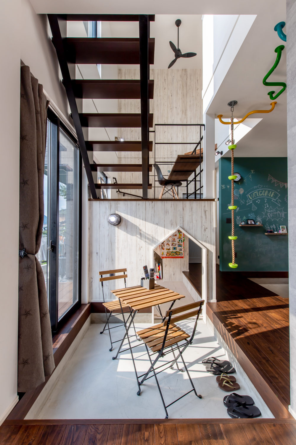 吹抜&スケルトン階段の下にあるスキップ収納は、土間仕上げのキッズスペースに。土間はLDKにも続いており、まるでオープンなサンルームのような魅力的なスペースになっています。