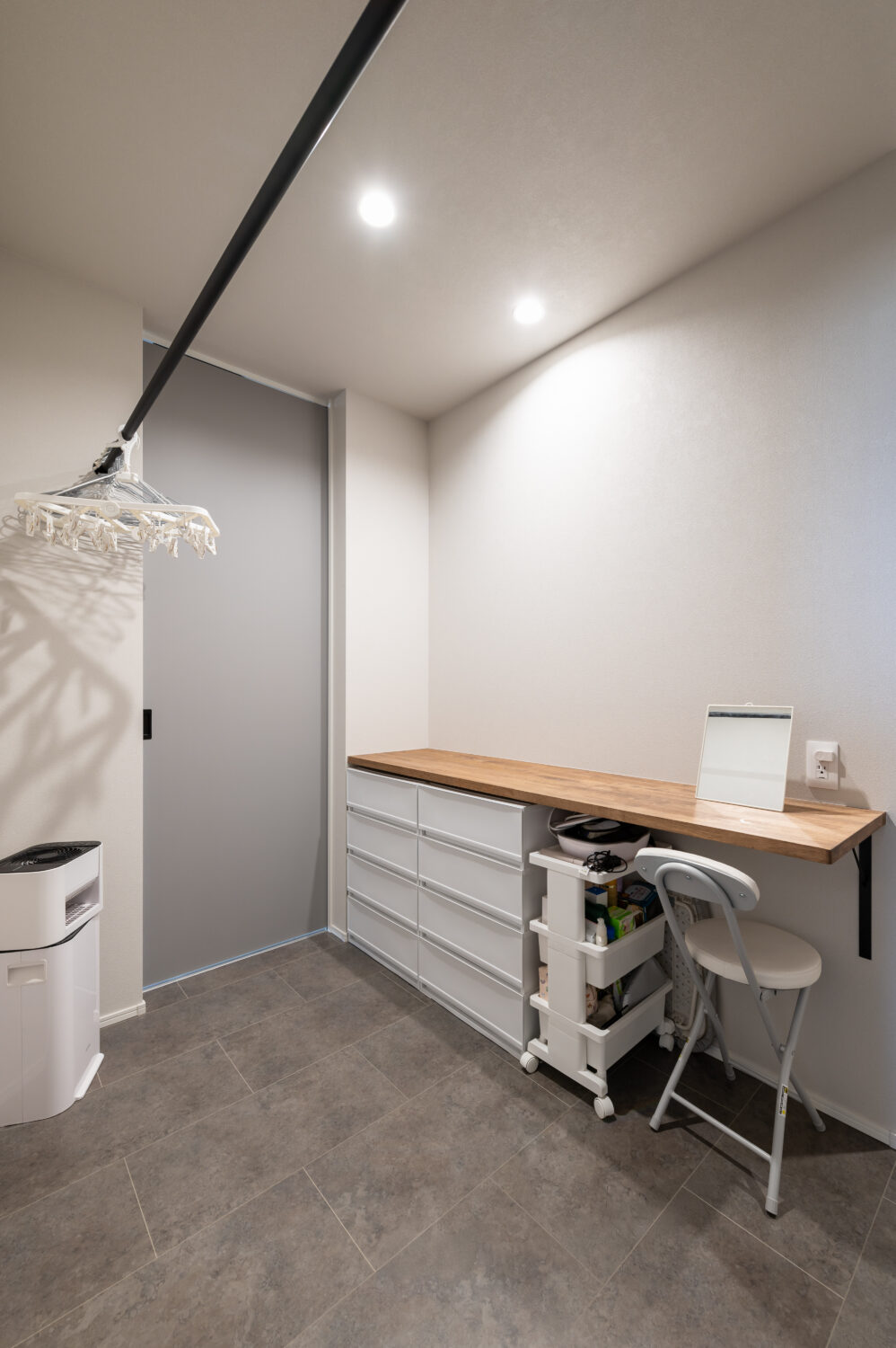 寝室横のウォークインクローゼットにはカウンターを設けパウダーコーナーにした、ドレスインクローゼット仕様にしています。