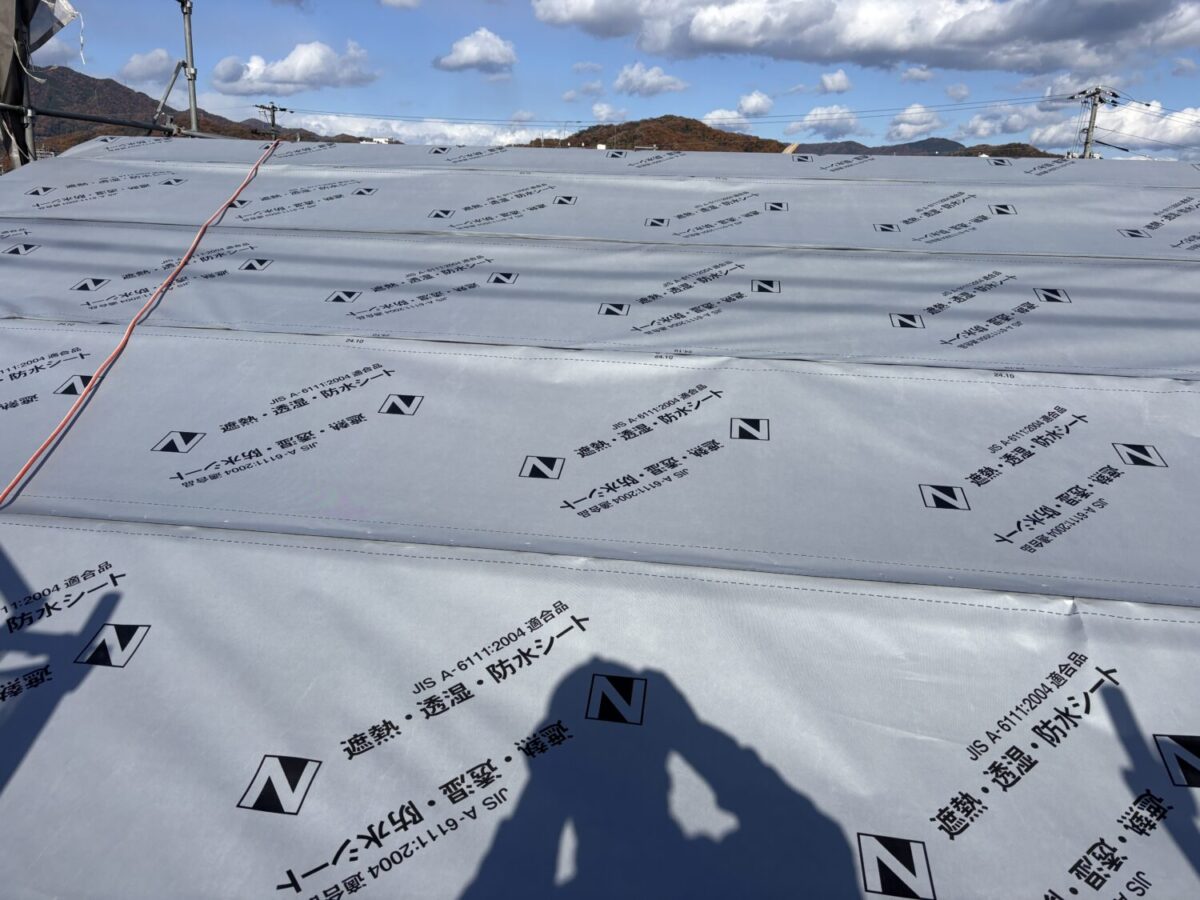 小屋組み完成後、遮熱・透湿・防水シートを施工します。