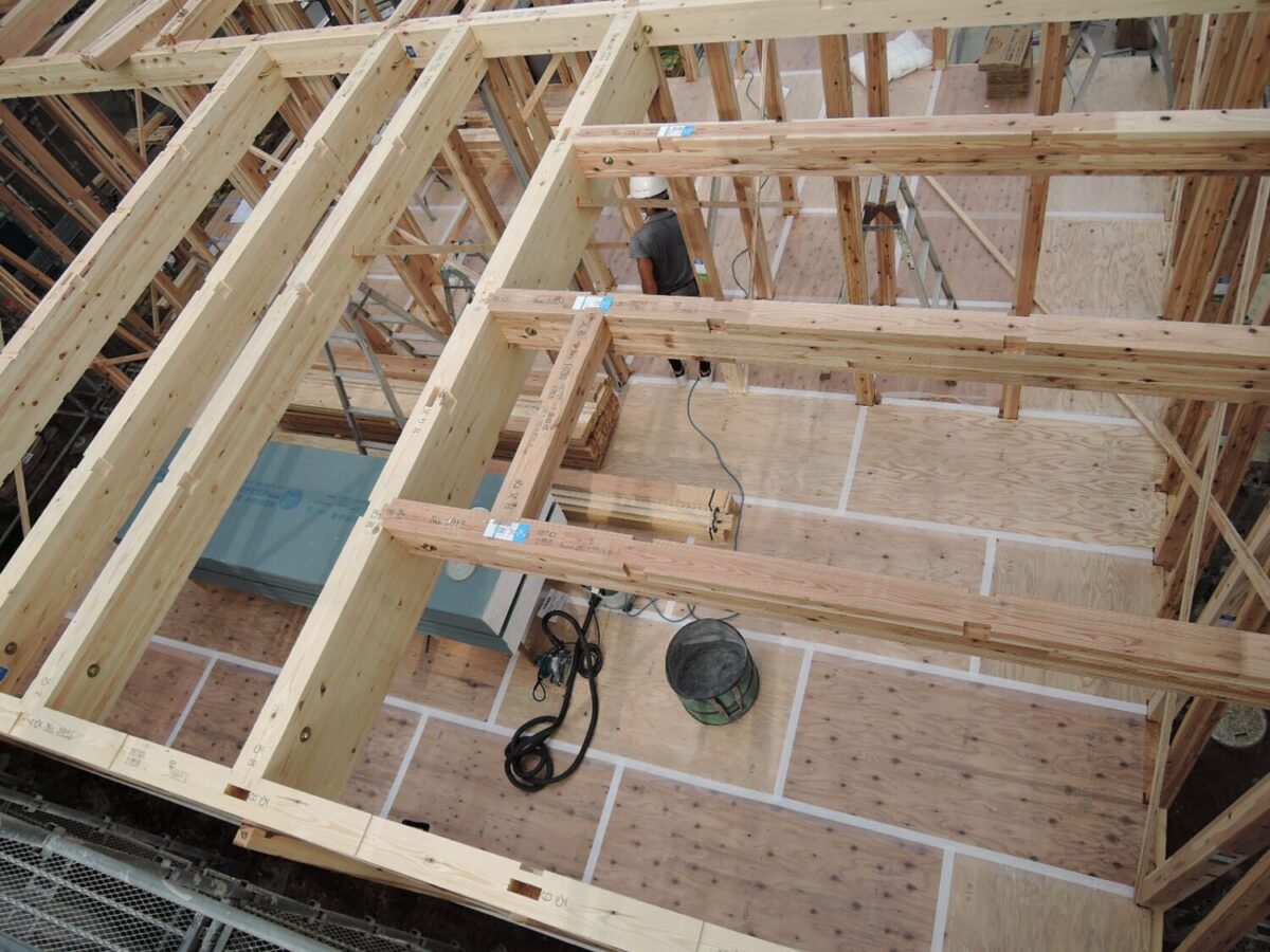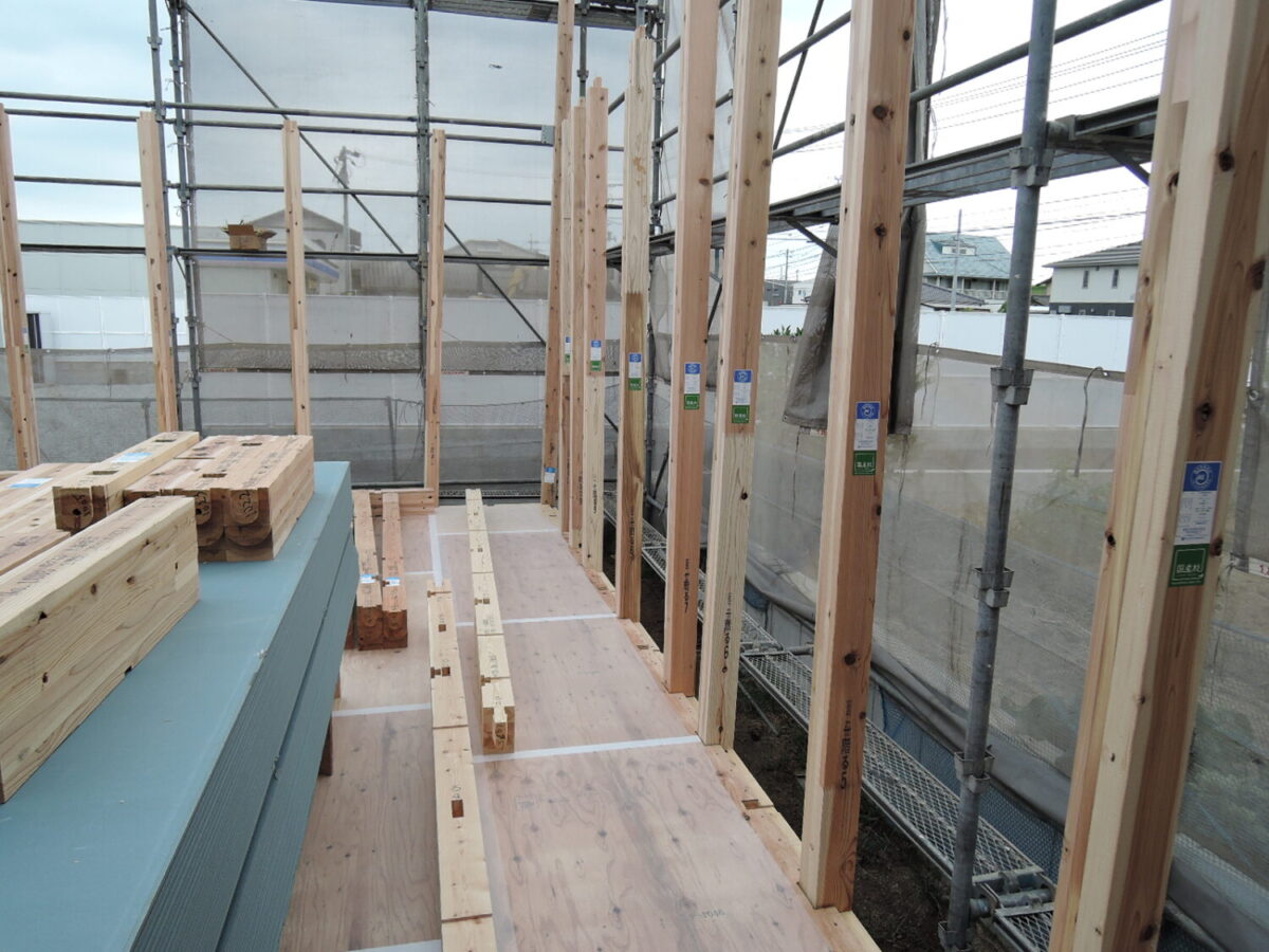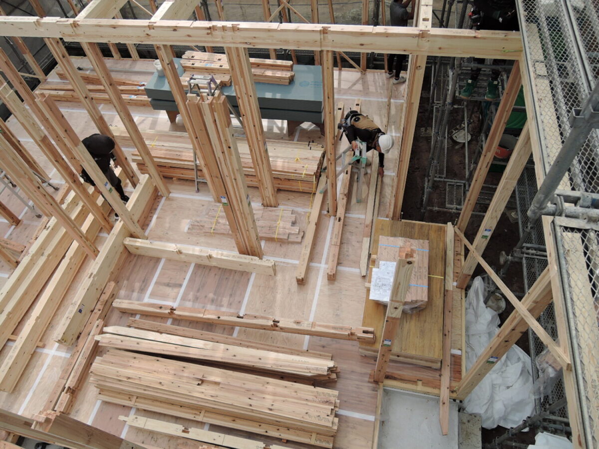 1階の柱を順番に建てていき、梁を組んでいきます。