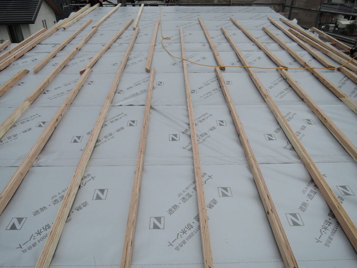 遮熱透湿防水シートを敷設し空気層を設け、屋根垂木を並べた上に屋根板を施工していきます。