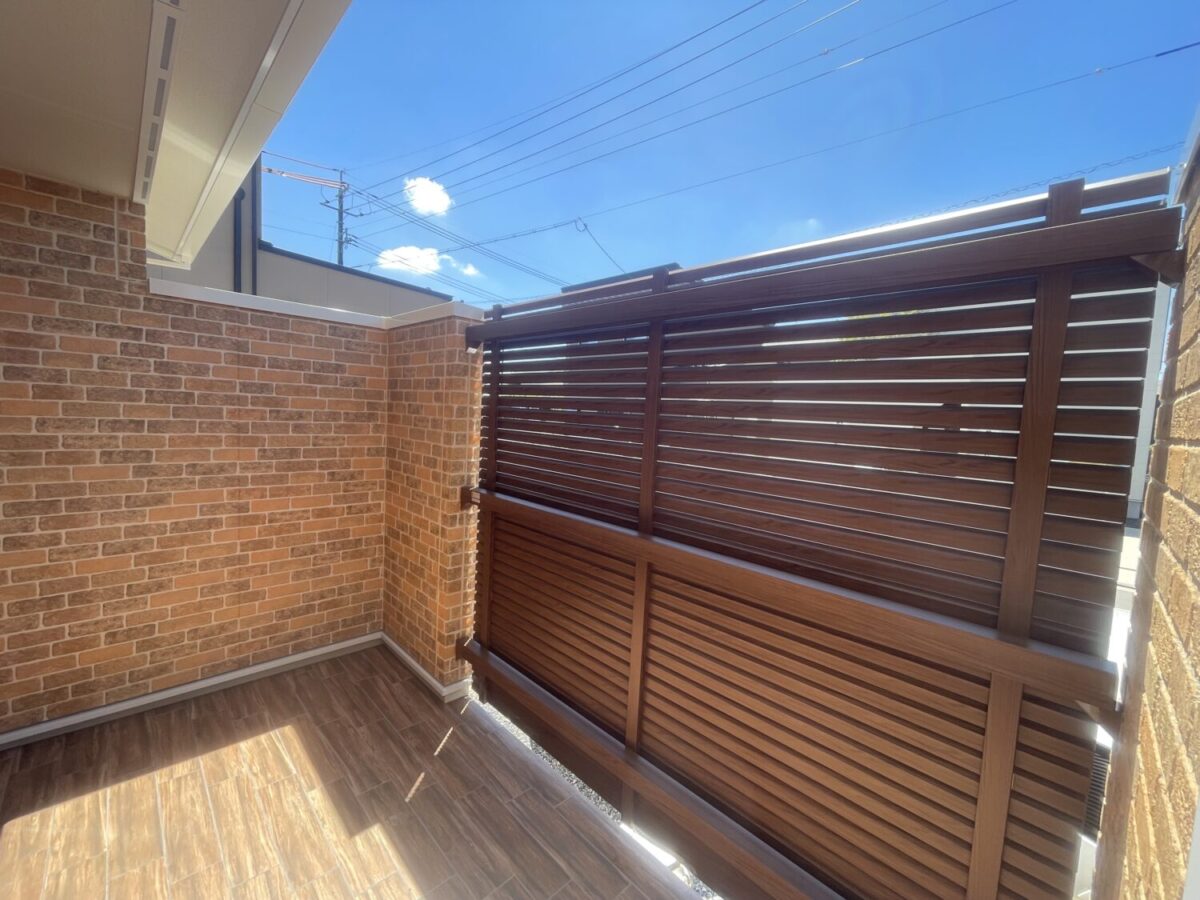 サッシ廻りにモールを施し、可愛らしく仕上げています。正面に横格子の目隠しを施し、道路からの視線をカットしています。