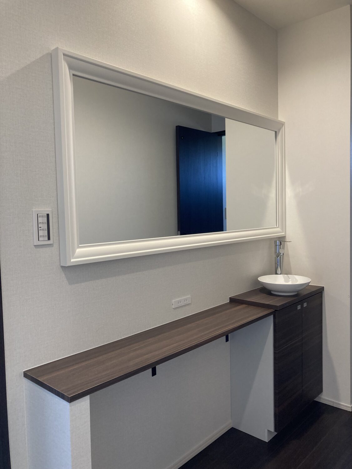 ミラーと人が立つ中間に照明を配置して顔に影ができないようご提案させていただきました^^