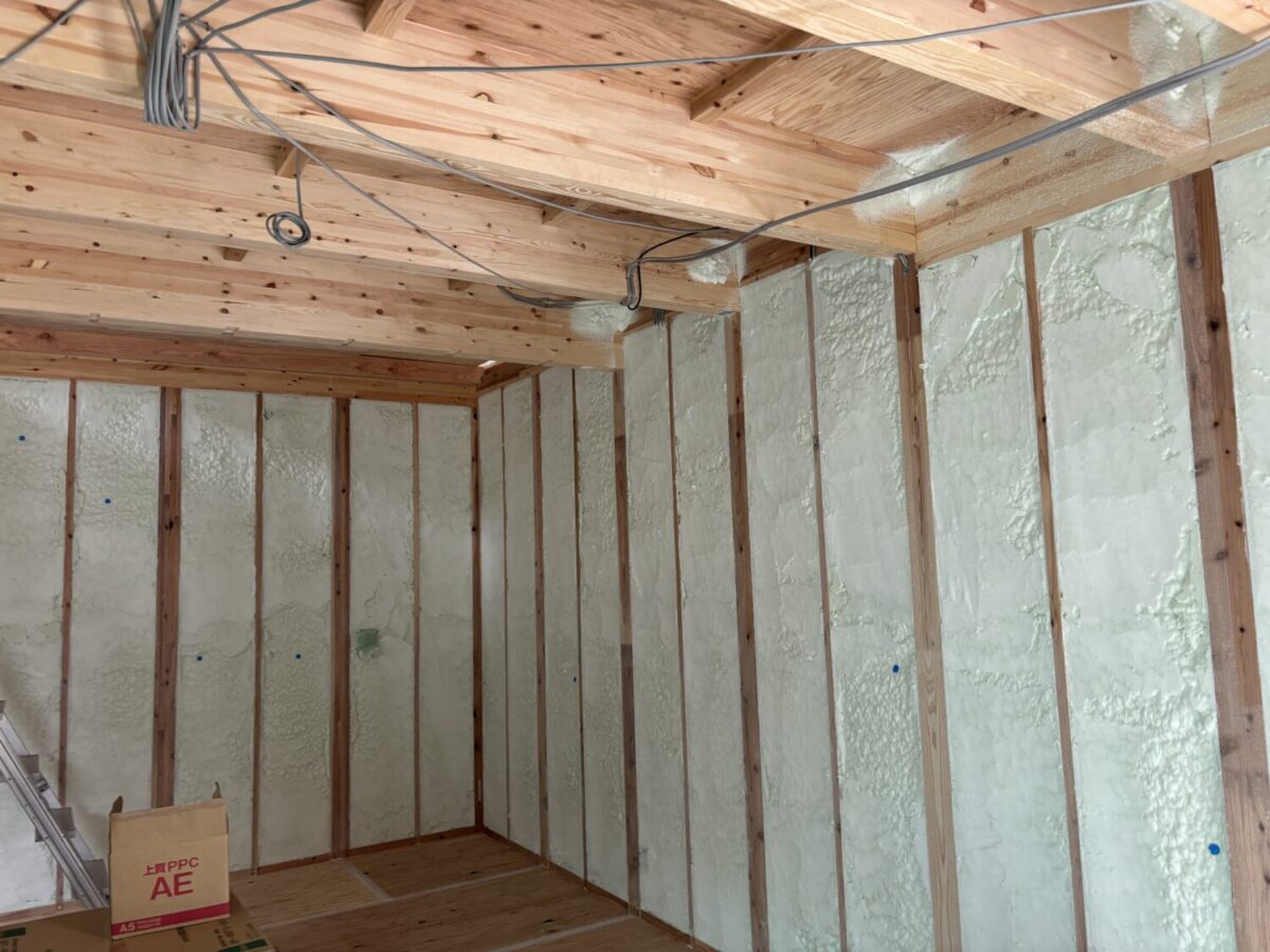 気密測定とは、建物のスキマがどれくらい少ないかを測定するものなのですが、上の写真のように隙間なく断熱材が吹き付けられているので、数値は良かったです。