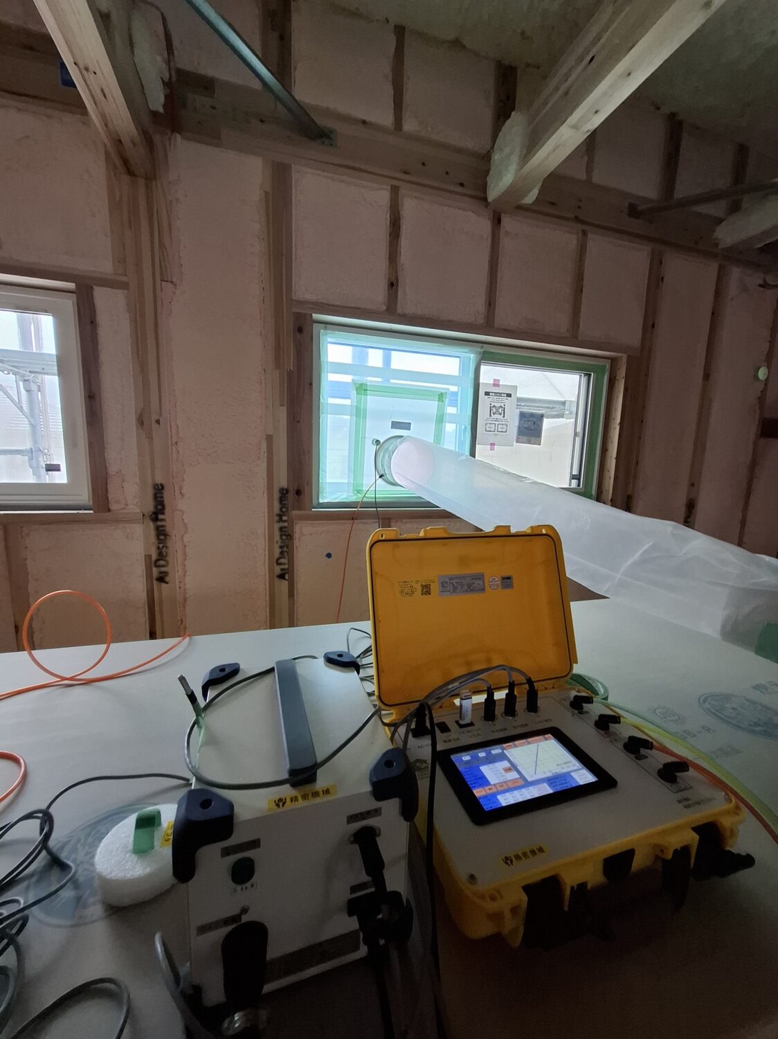 2階の窓から気密測定を行いました。GX志向型住宅の場合、サッシも樹脂サッシになりますので、気密性も更に上がります。