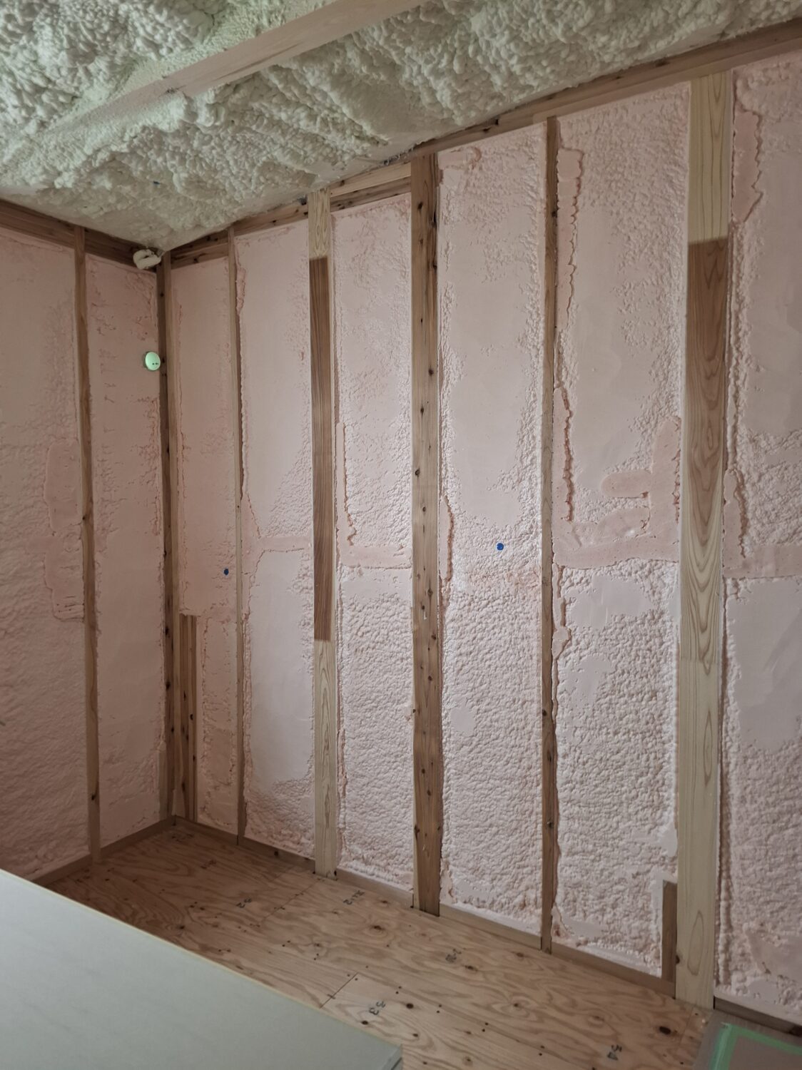 O様邸はGX志向型住宅(断熱等級6)のお住まいです。等級6を達成する為に、断熱材が少し違うものに変わります。ピンク色になってちょっと可愛い感じになっています。(実際には見えなくなりますが)