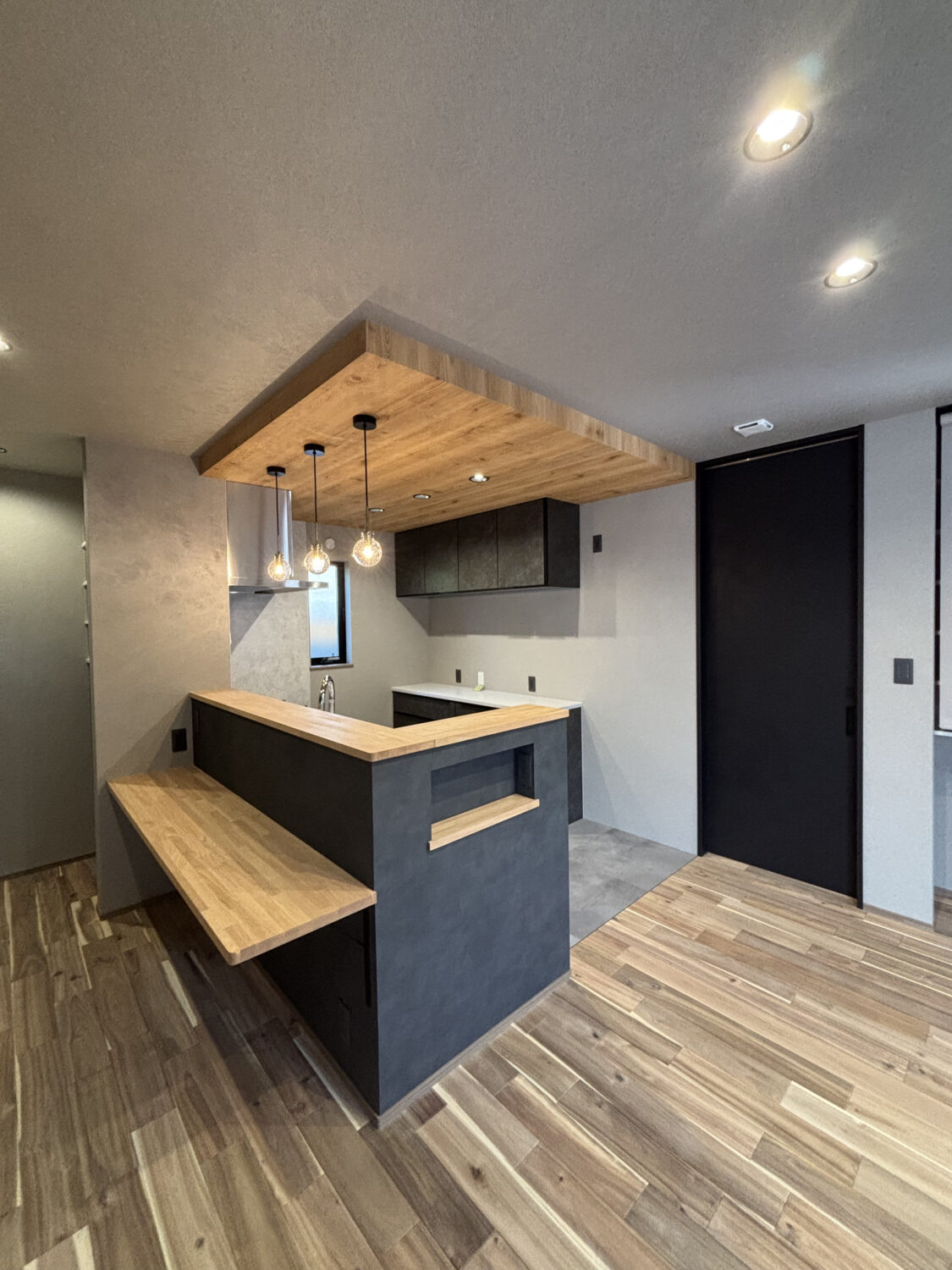 キッチン上を折下天井にして、木目柄のクロスを貼っています。