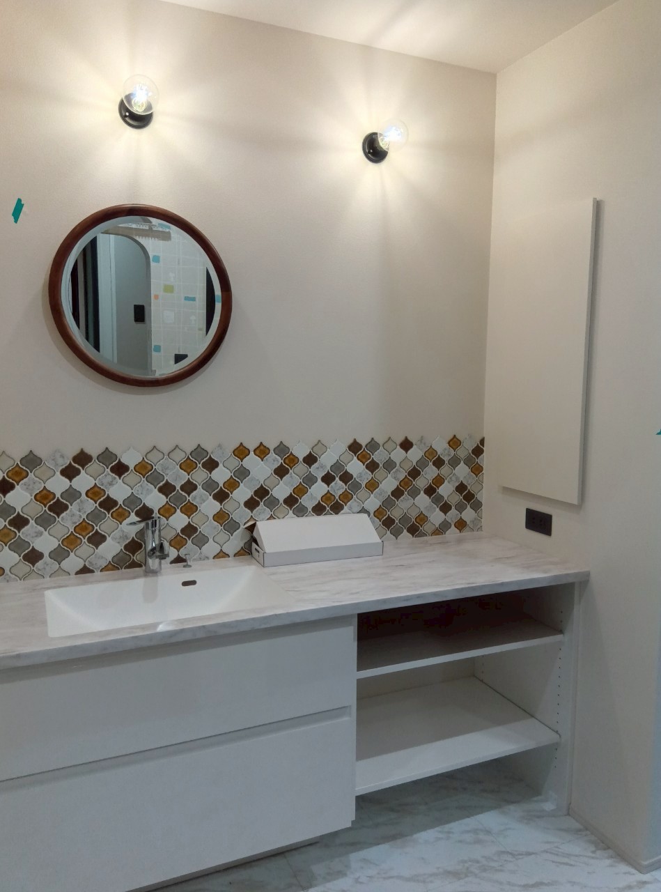 洗面・ランドリーは丸いミラーとタイル貼りでかわいらしい雰囲気に!