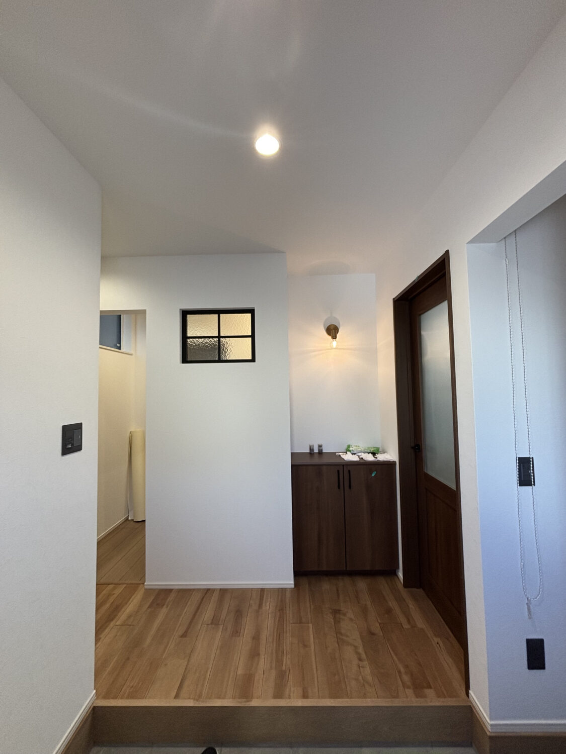 玄関入ってすぐ格子付の小窓と収納、ライトがお出迎えしてくれます!