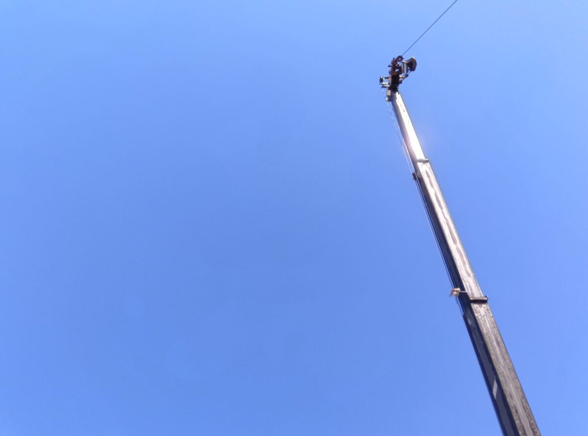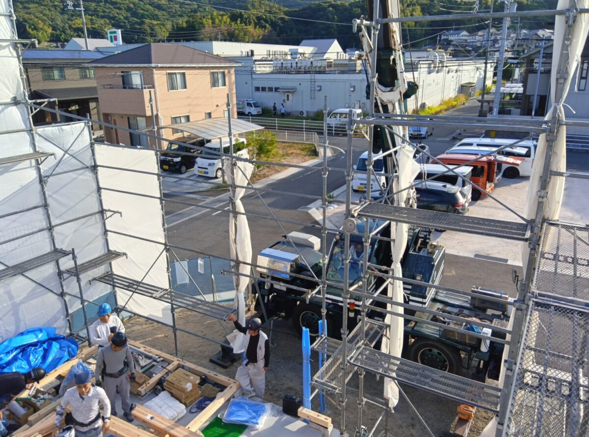 足場ネットを 張ってレッカー設置、作業開始準備です。