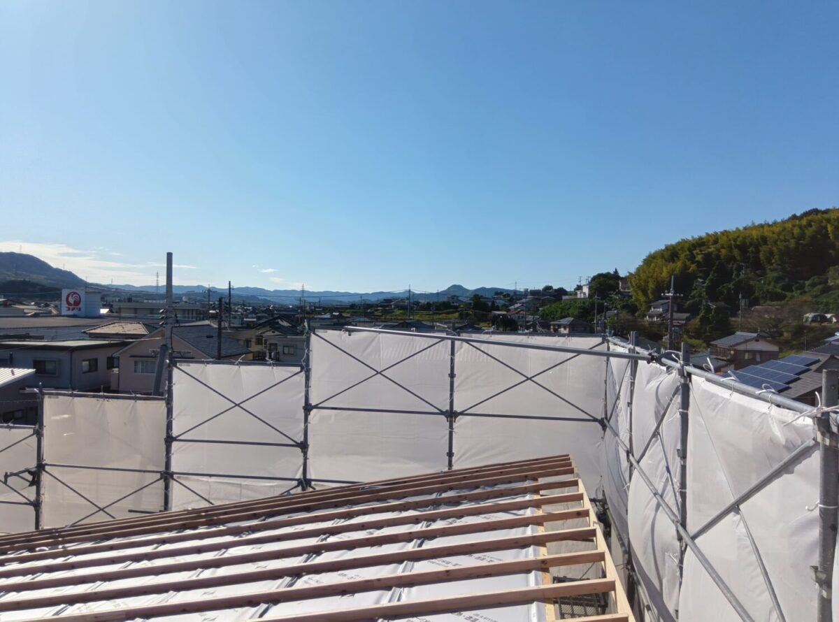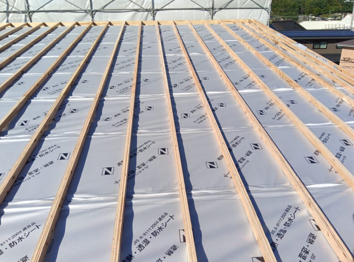 小屋組が終わり遮熱シートを張って垂木を組んだところ。