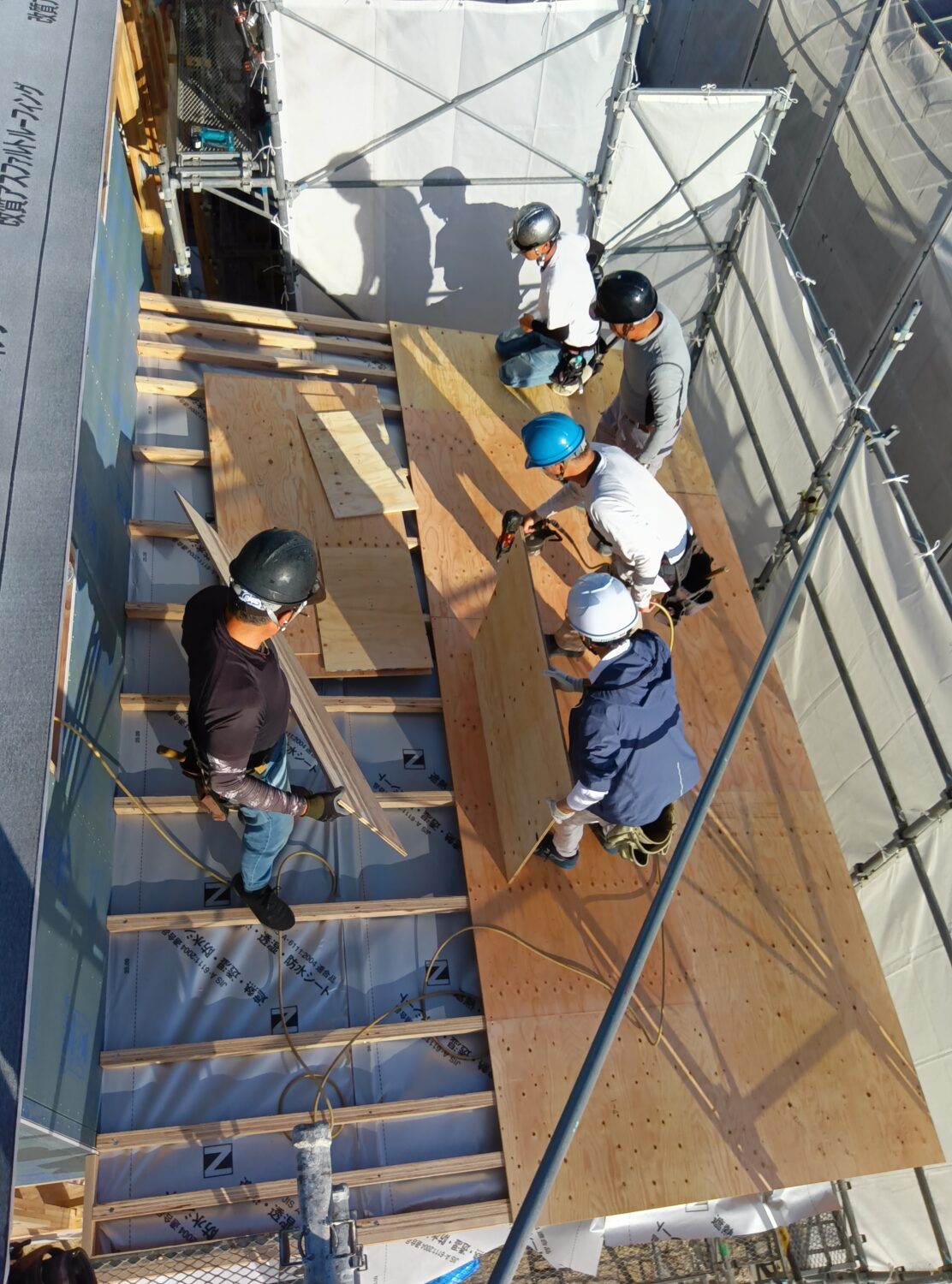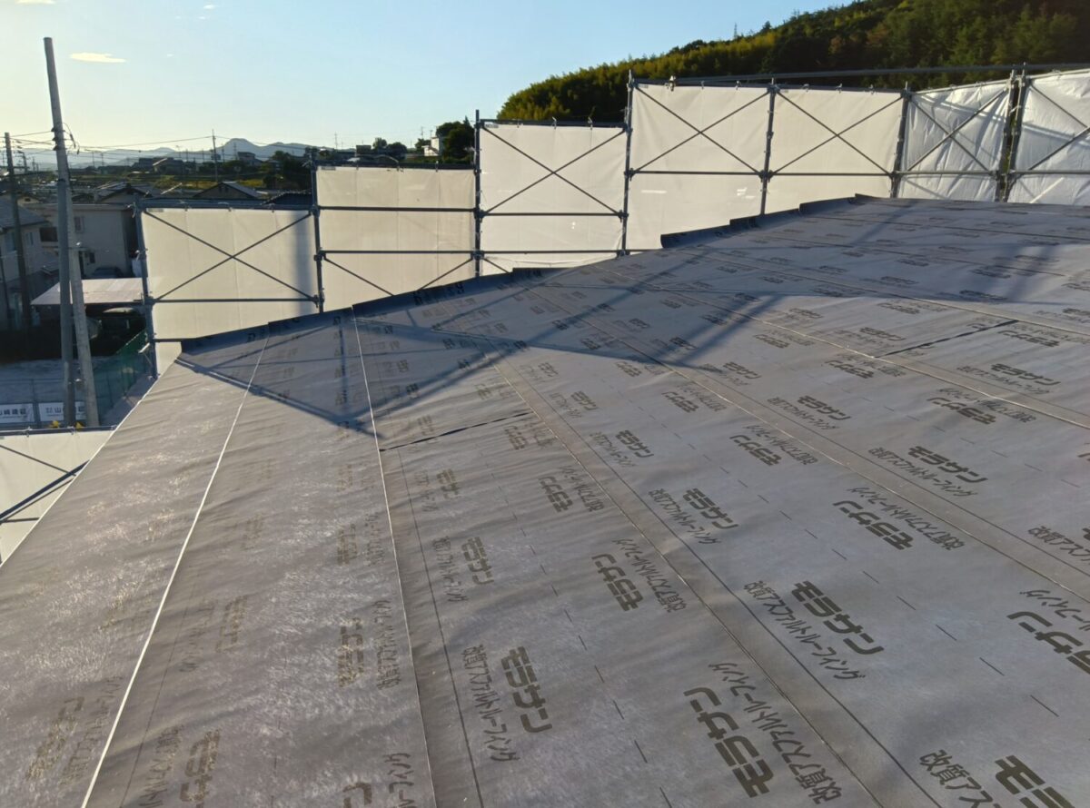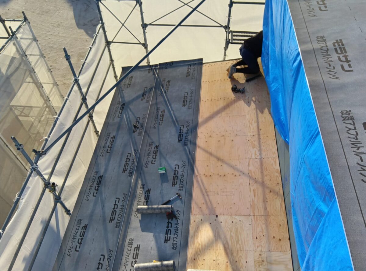 最後に屋根屋さんがルーフィング張りを行い本日の作業はすべて終了です。
