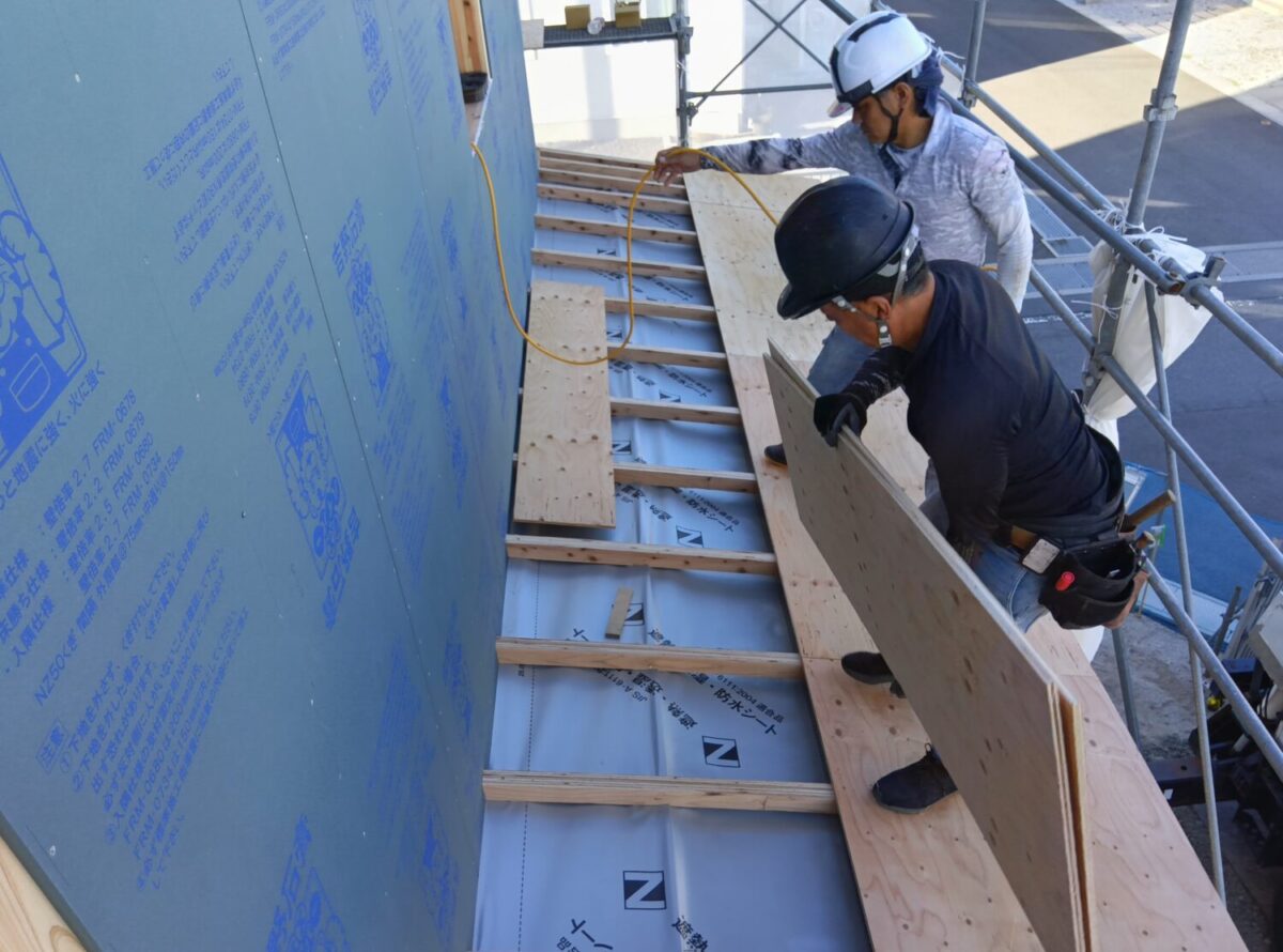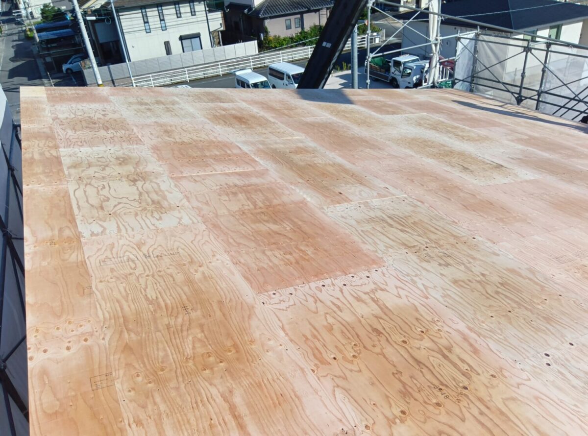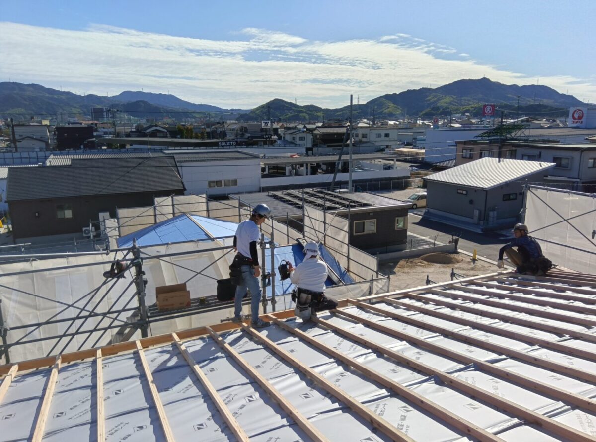 最後に屋根屋さんがルーフィング張りを行い本日の作業はすべて終了です。