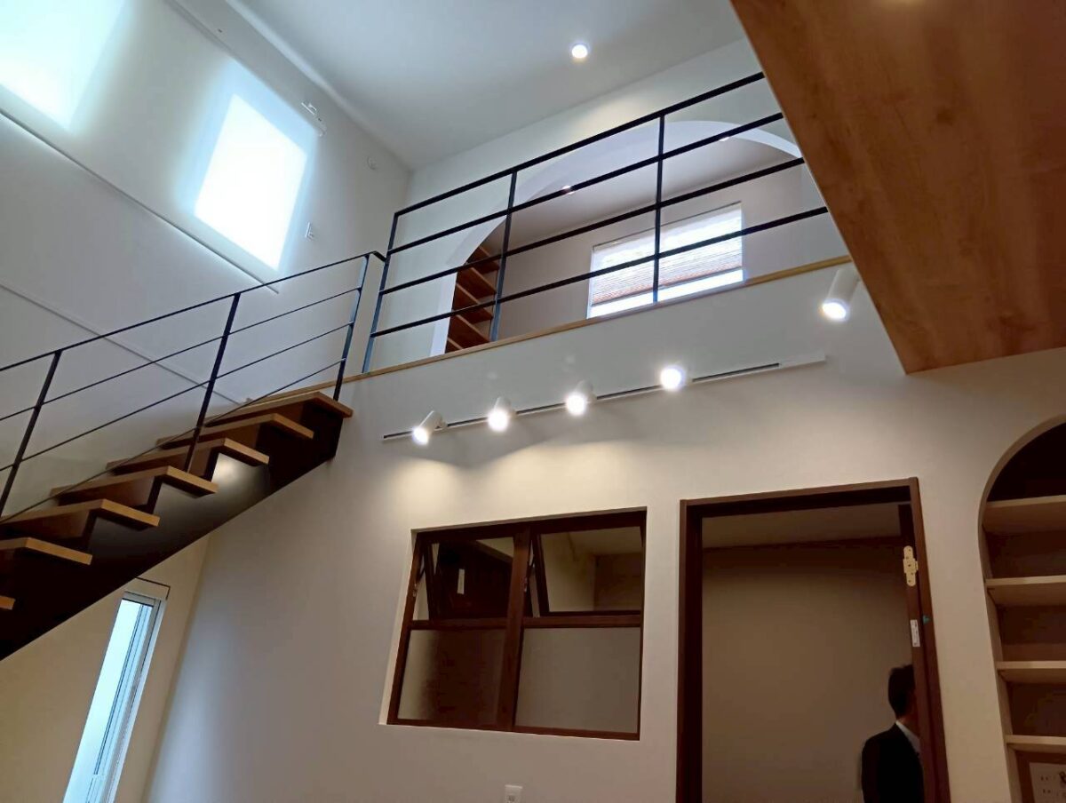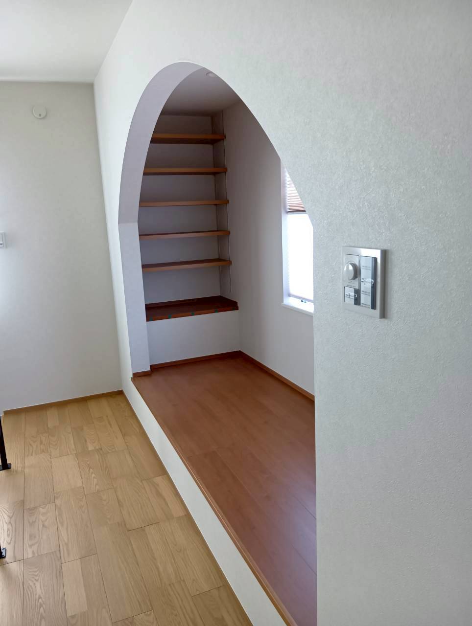 階段を上がった先にアーチで縁取られた2帖ほどの空間(ヌックスペース)が設けられています                ヌックとは『居心地のいいこじんまりとした空間のこと』でスコットランド語の「ヌーク(neuk)」が語源と言われているそうです