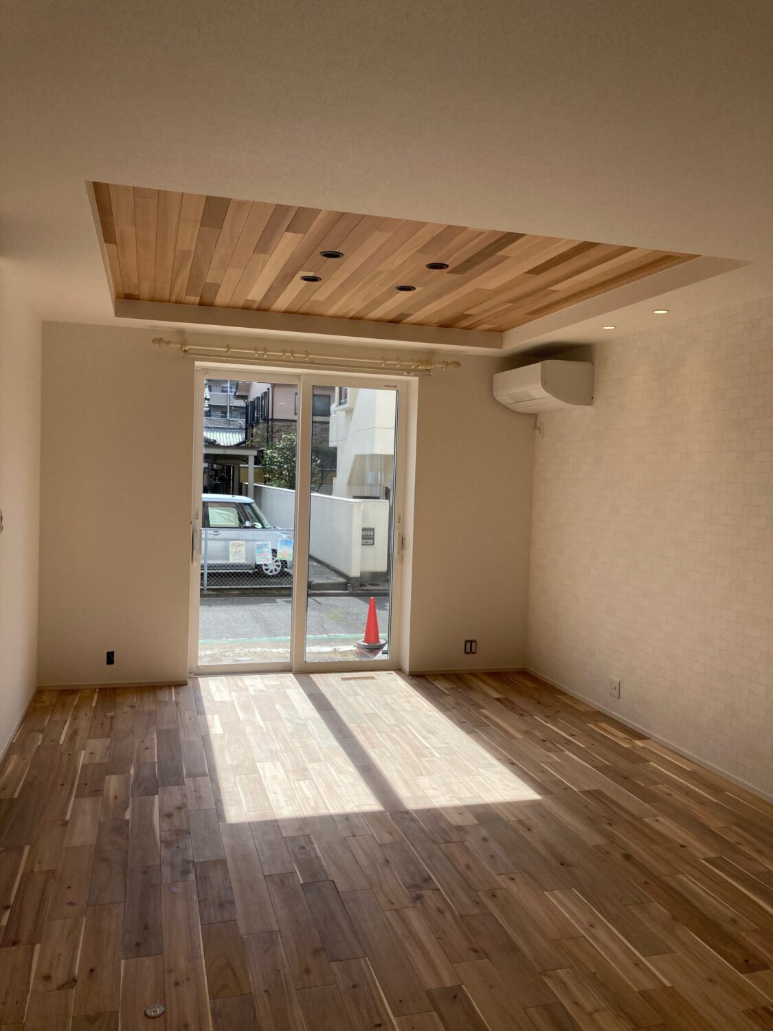 リビングの天井は折上天井にして、レッドシダーを貼られています。