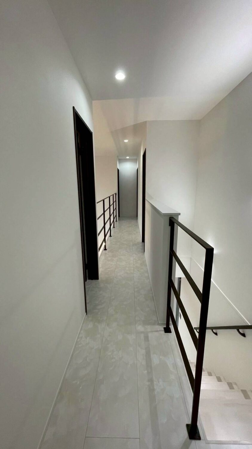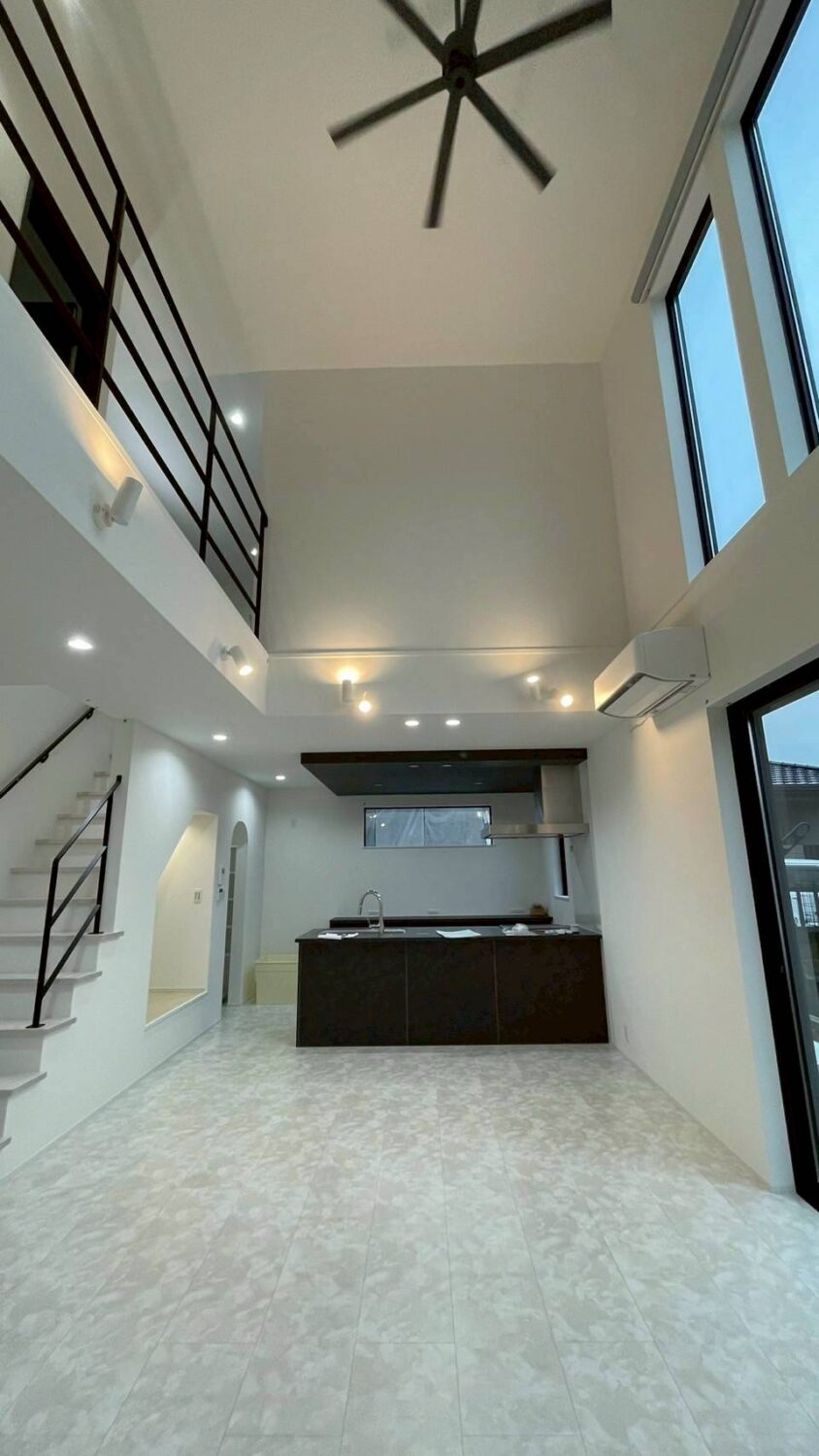 ホワイトを基調にした、清楚で柔らかい印象の空間、ブラックの手摺や吹抜ファンが全体を引き締めて