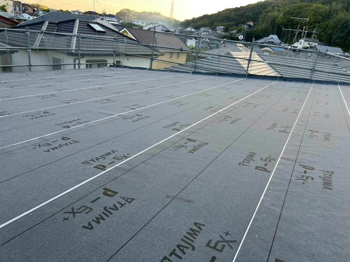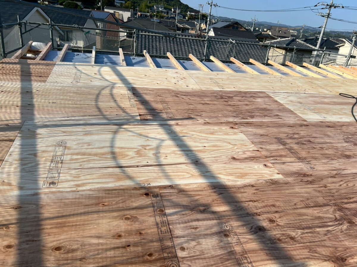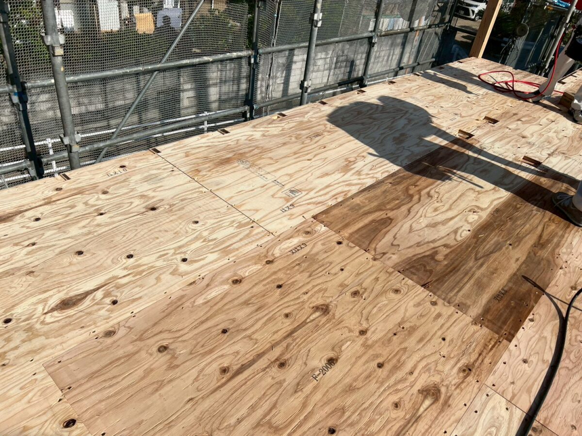 屋根板上にルーフィングを施工し雨仕舞いを致します。