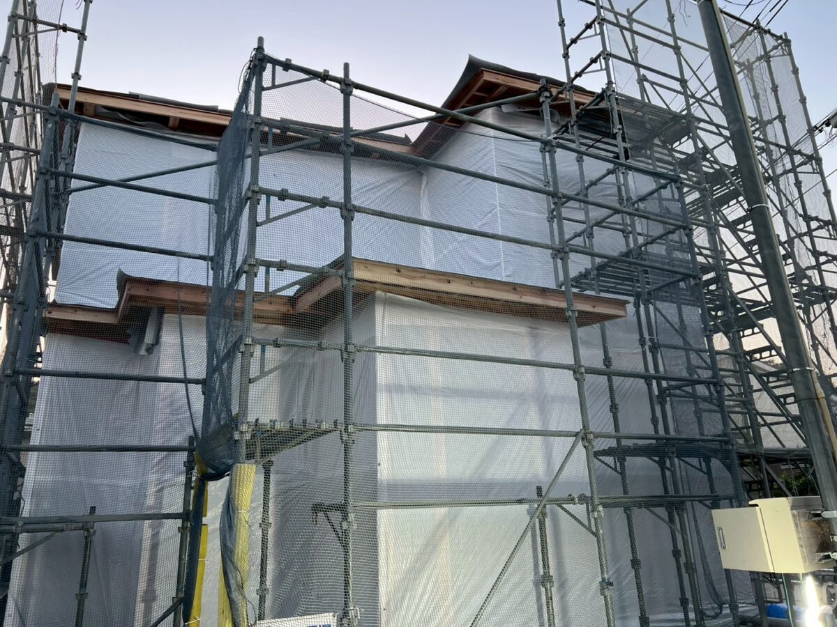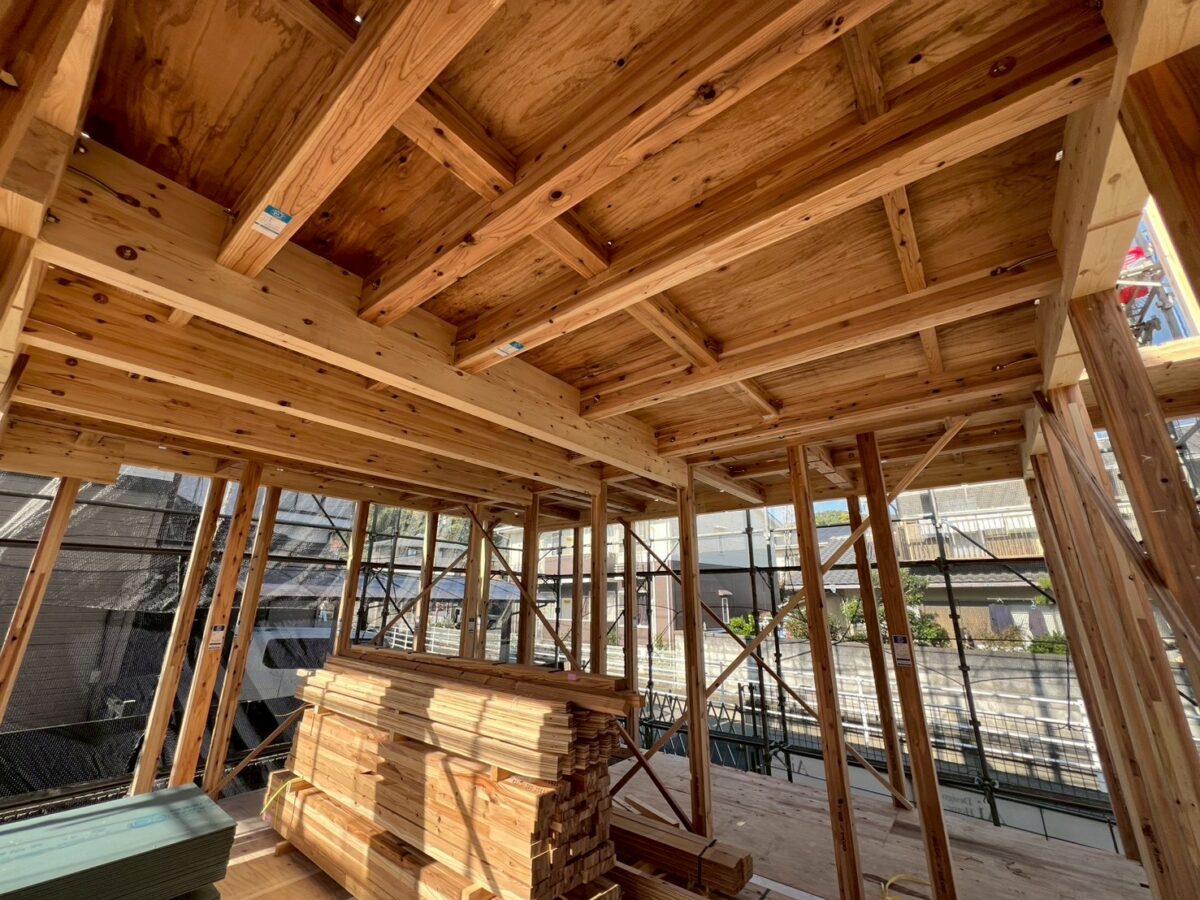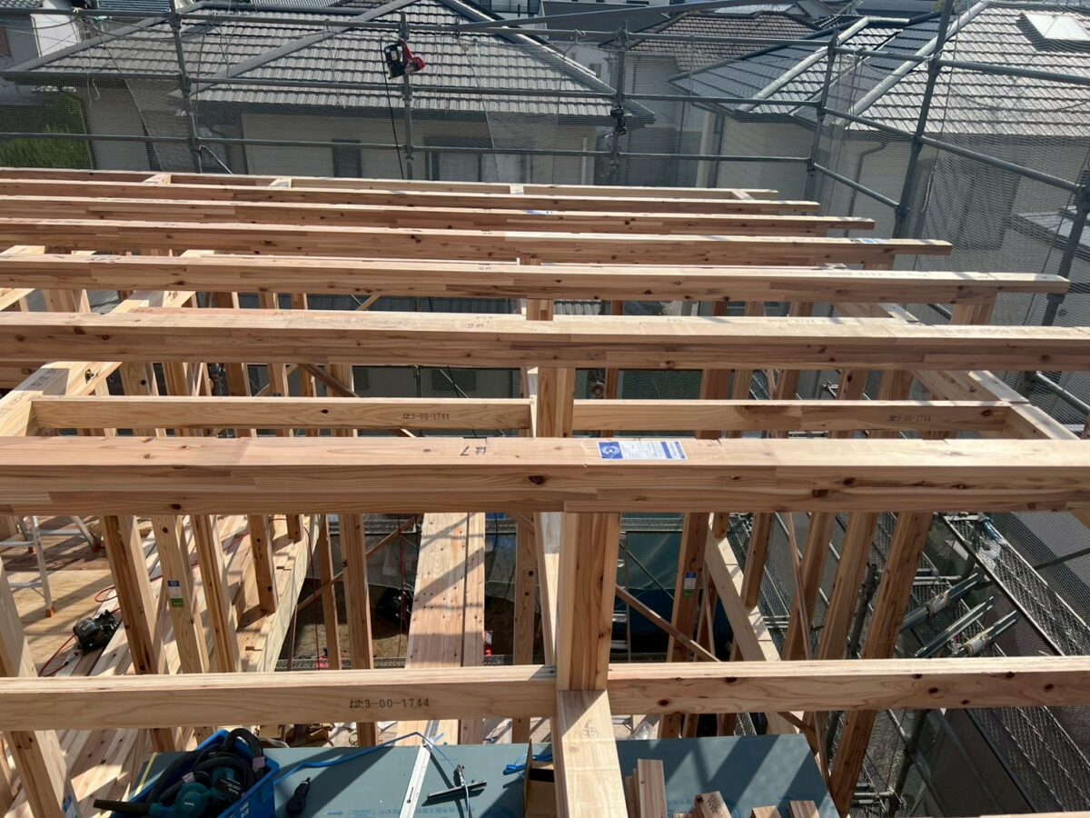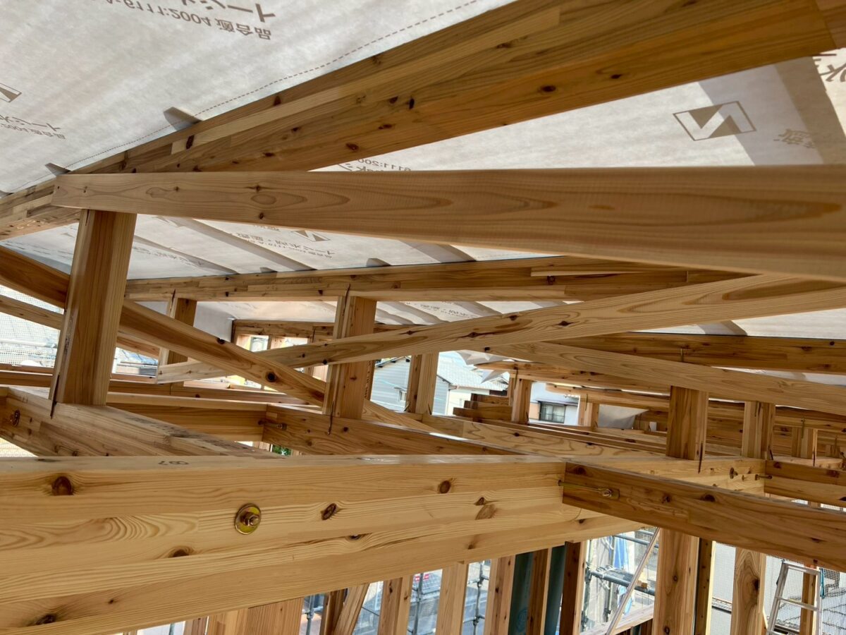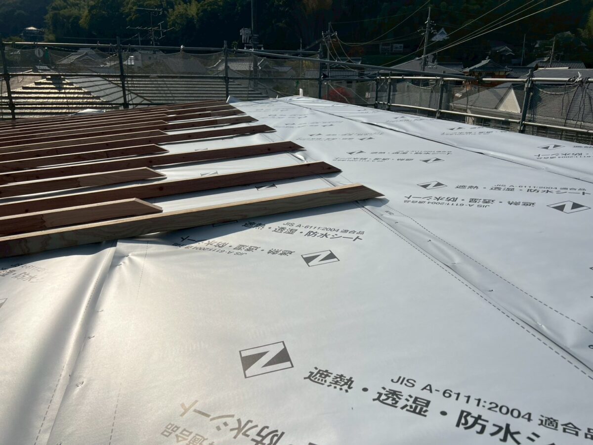 次に小屋組して遮熱・透湿・防水シートを施工し垂木材を施工致します。