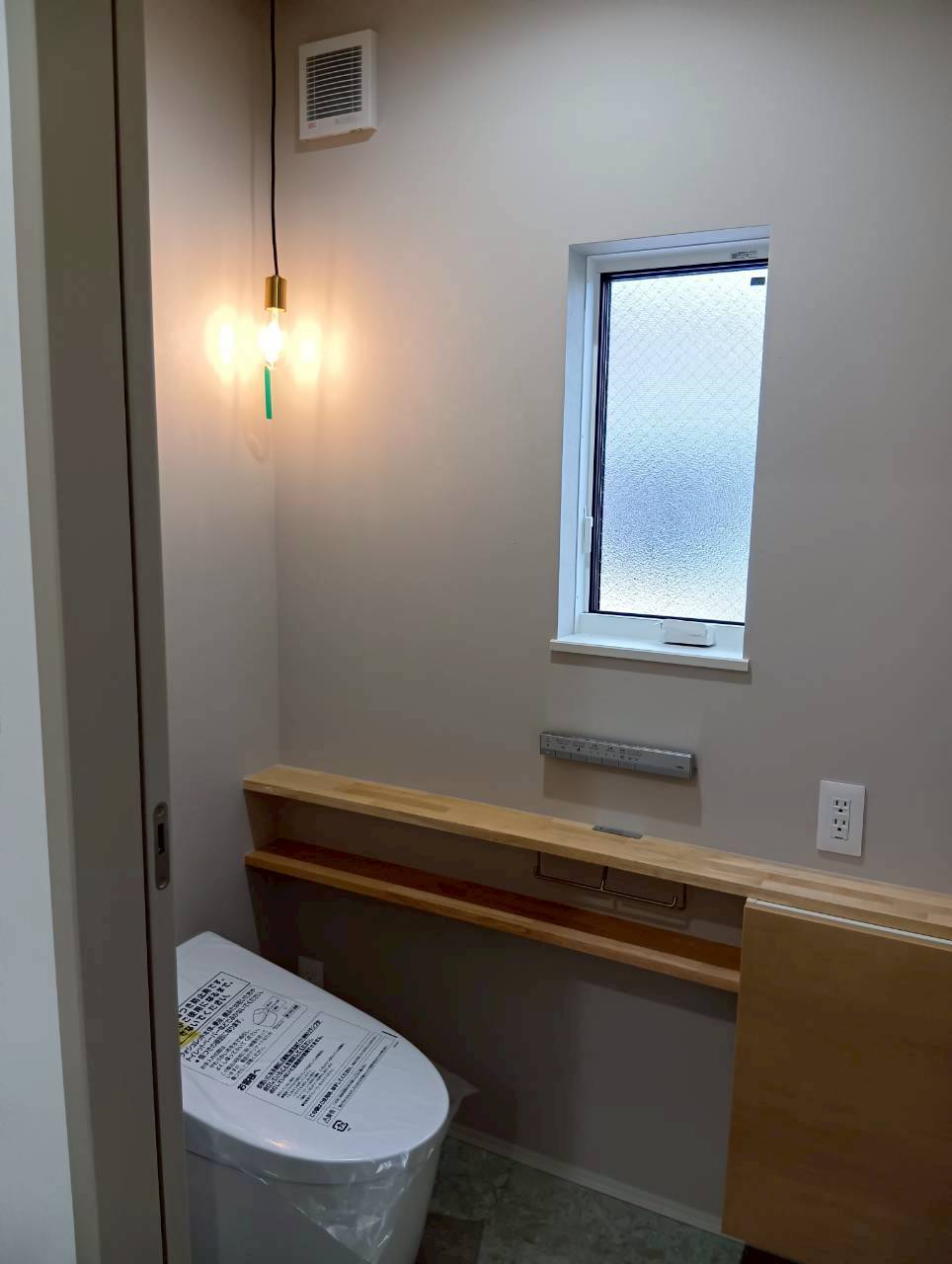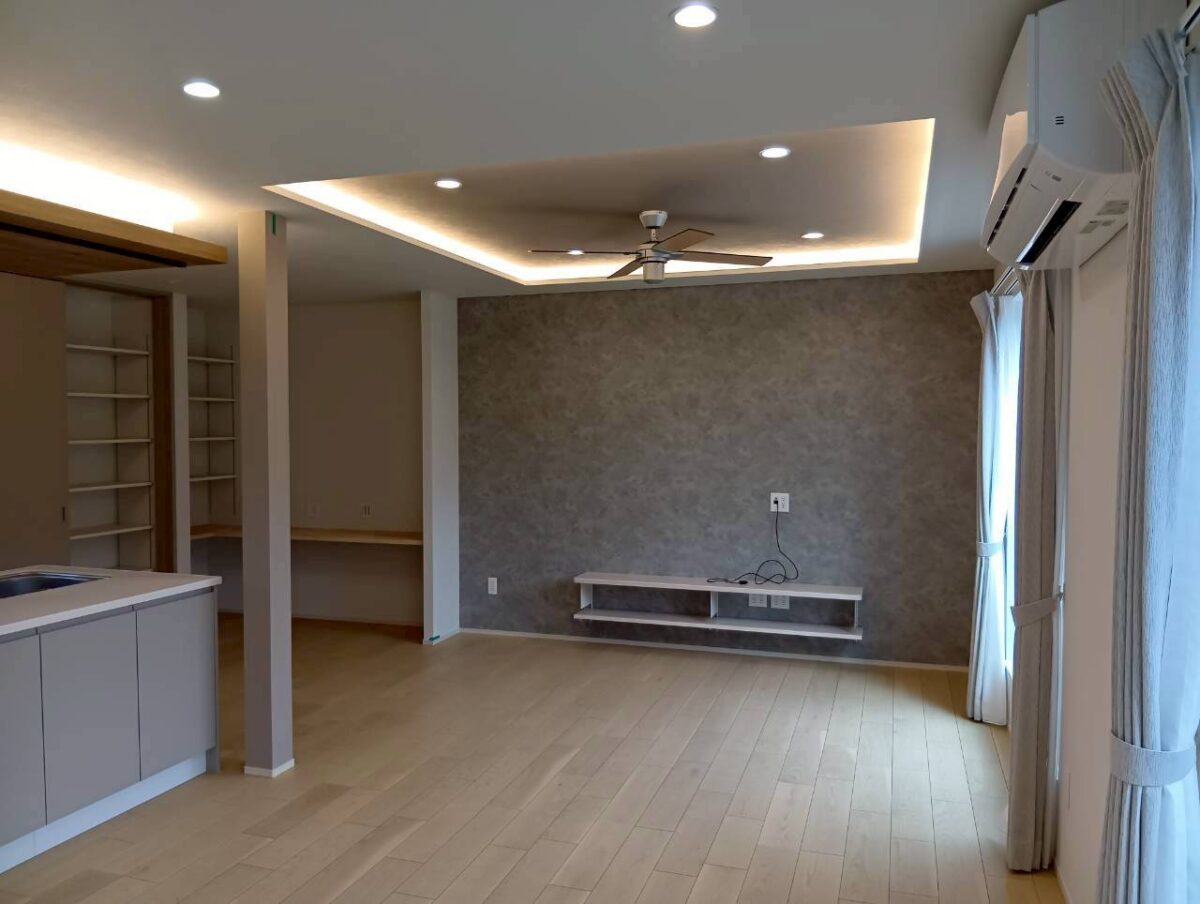 全体を包む明るめのグレーの壁紙に、エイジングホワイトの床が映えるナチュラルで洗練された住宅