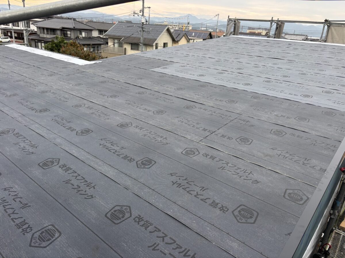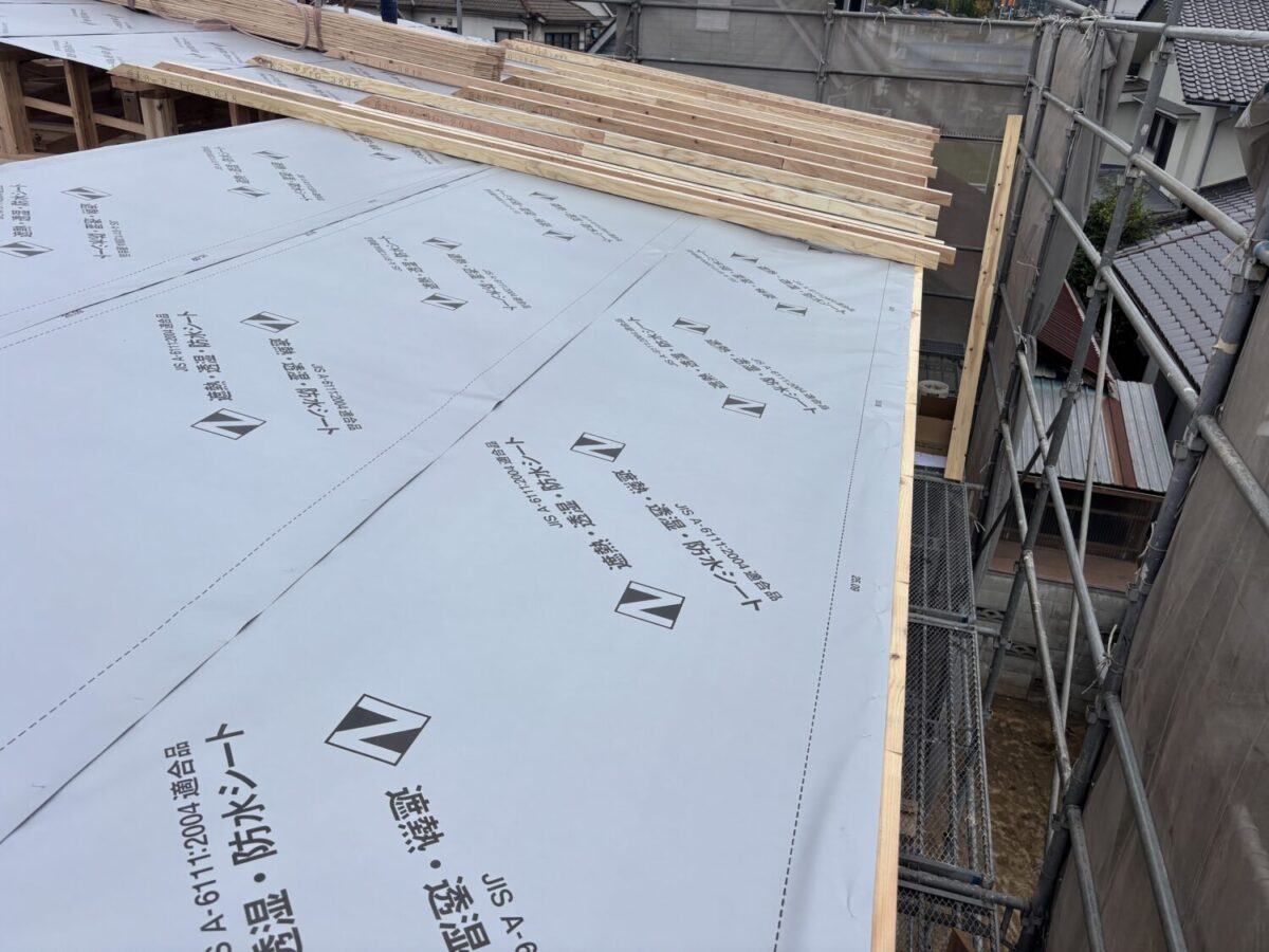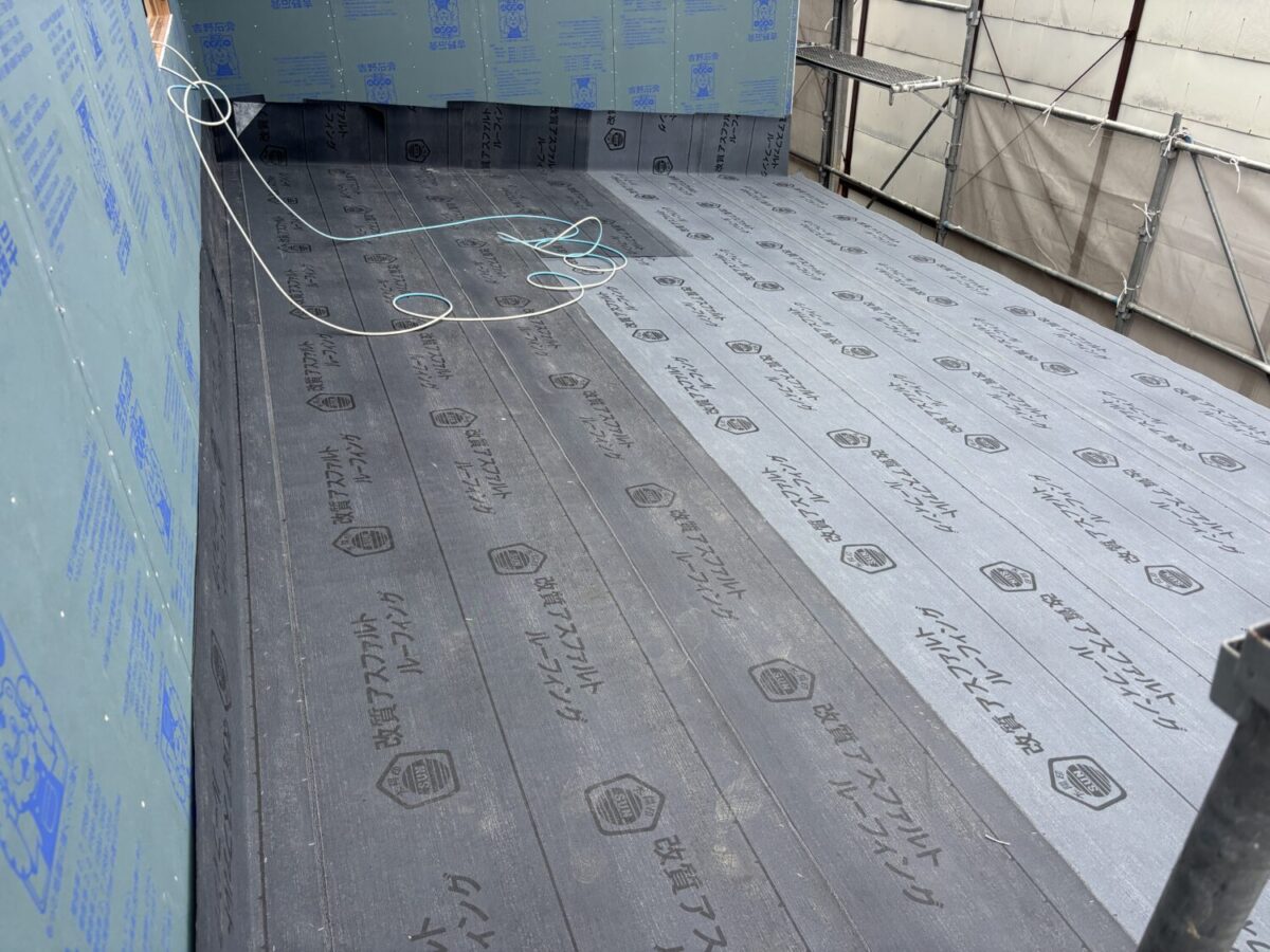 上棟当日にルーフィングを施工し雨仕舞いをします。