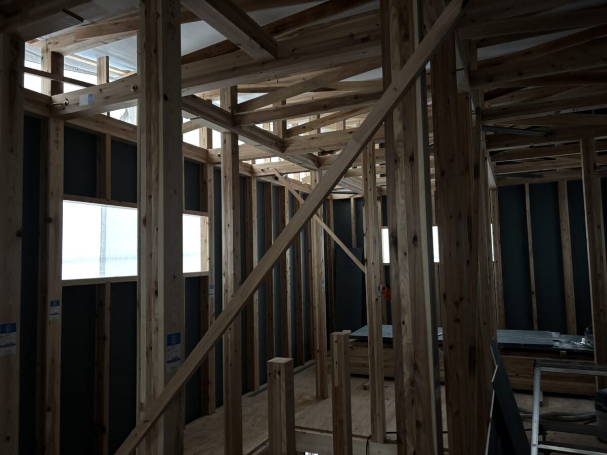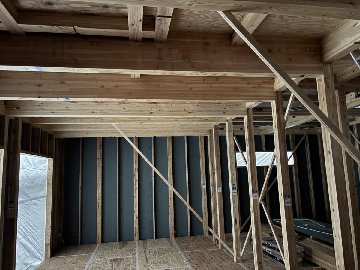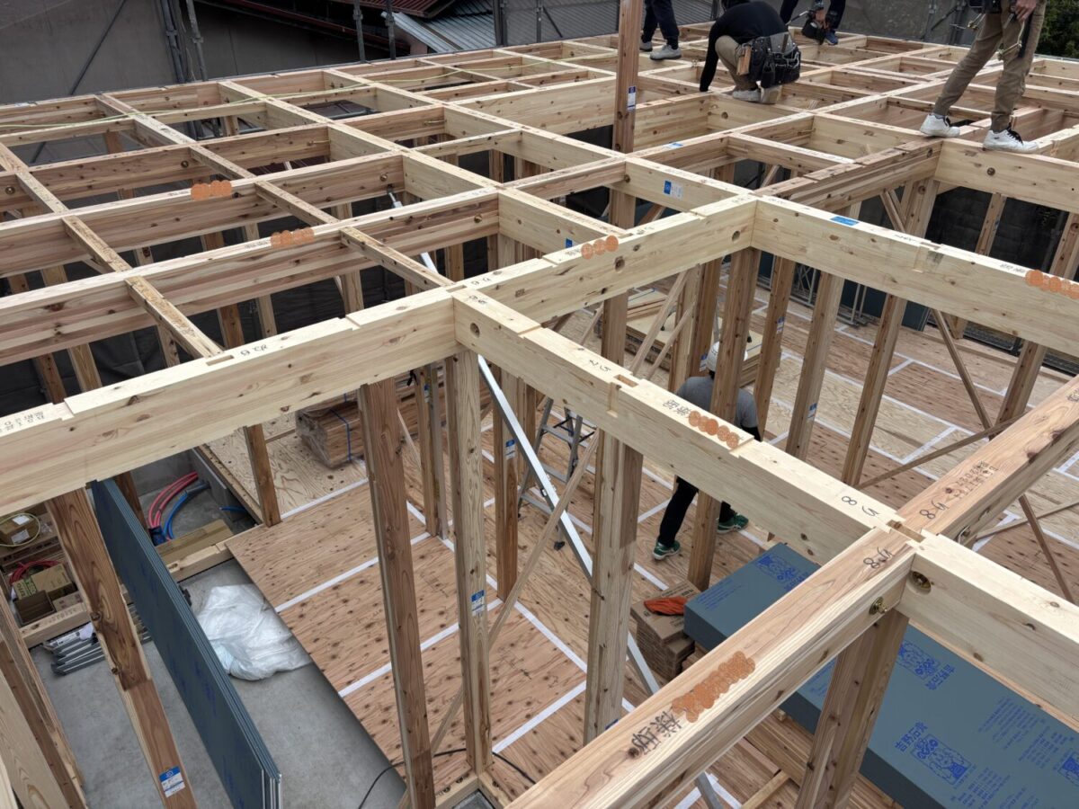 上棟当日にルーフィングを施工し雨仕舞いをします。