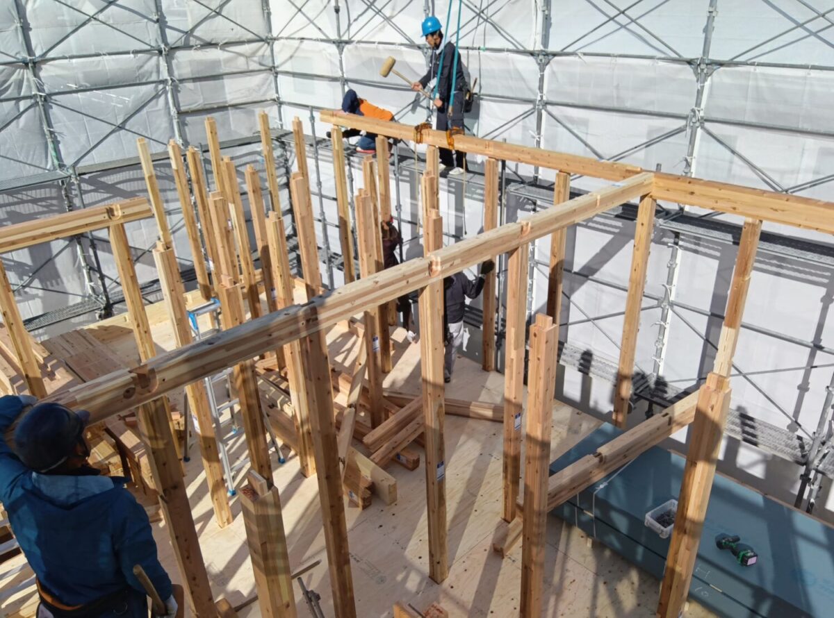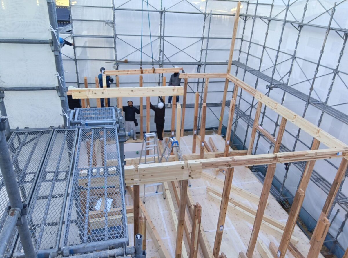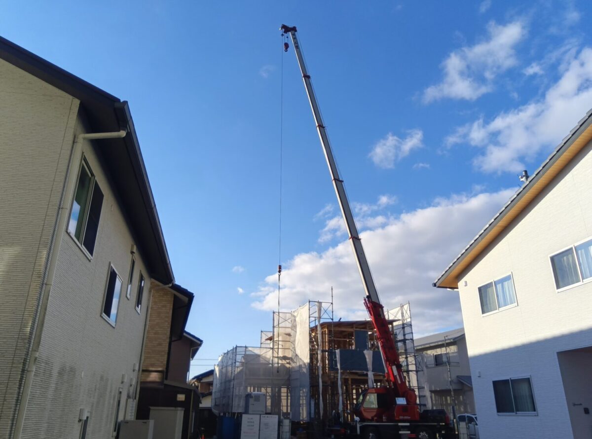 レッカーを使い横架材をククランプで吊って組んでいきます。