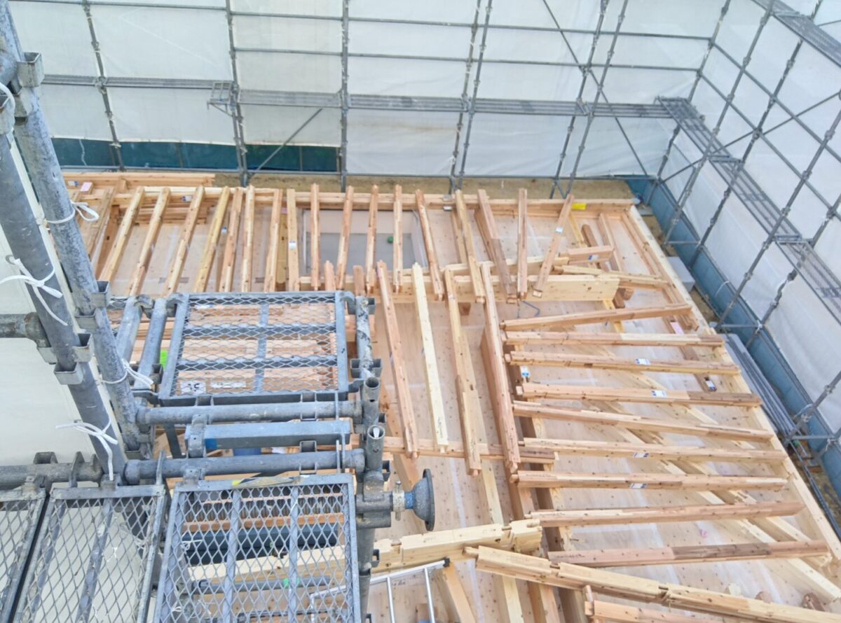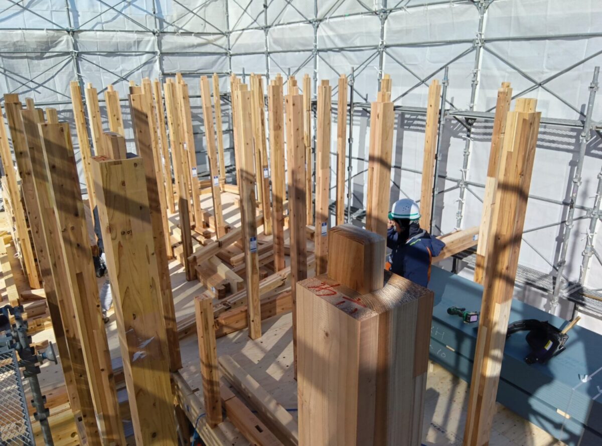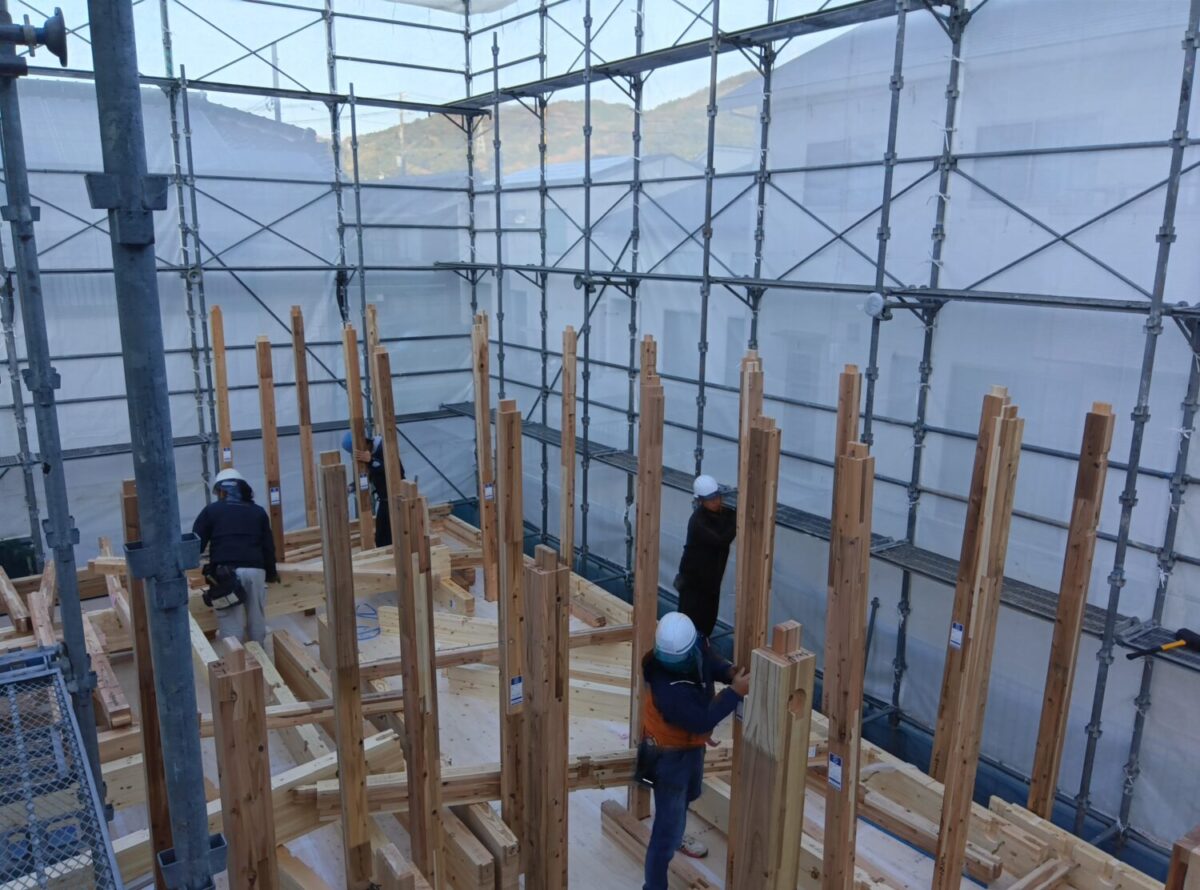 レッカーを使い横架材をククランプで吊って組んでいきます。