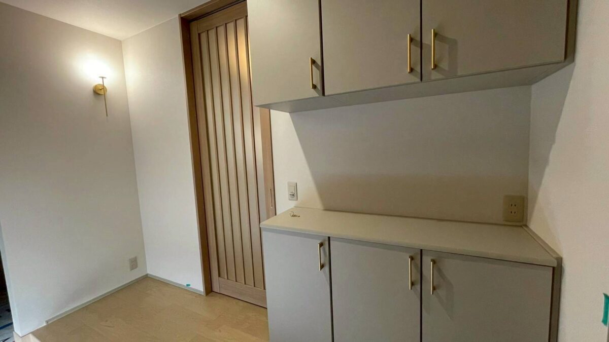 ゴールドの把手や照明器具が上品な雰囲気を演出しています。