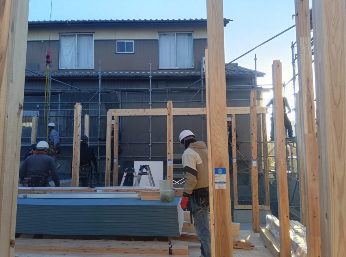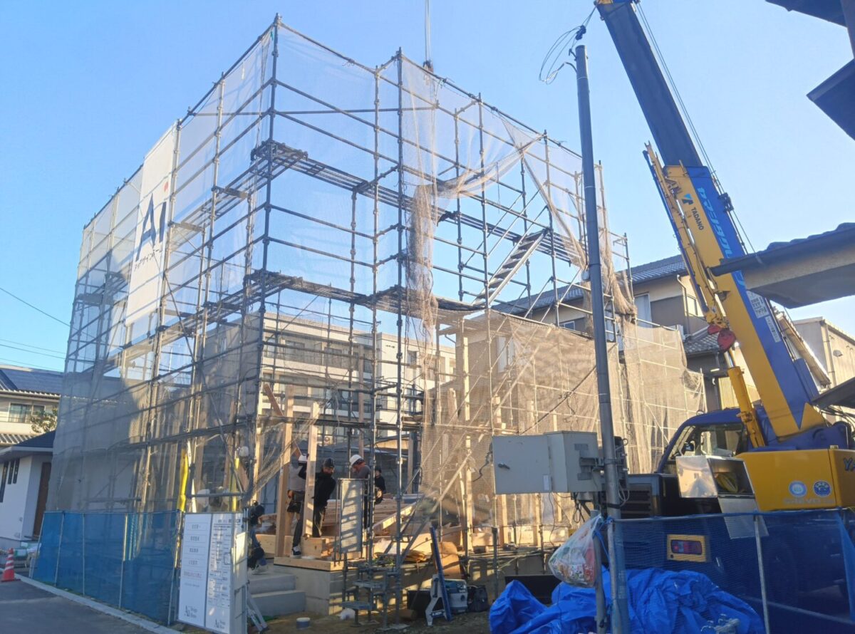 建物廻りをシートで覆い無事に上棟作業は終わりました