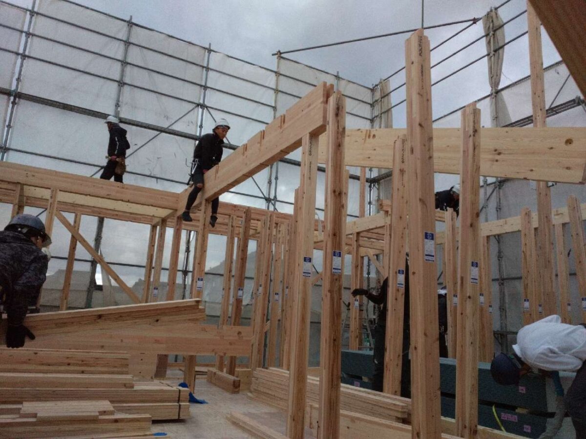 1F柱、梁、2F床、柱、梁、屋根と進んでいきます。