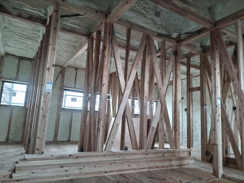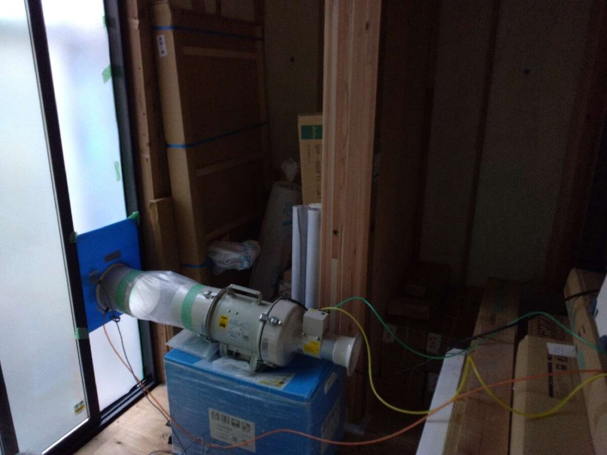 N様邸にて吹付断熱工事後の気密測定を行いました。