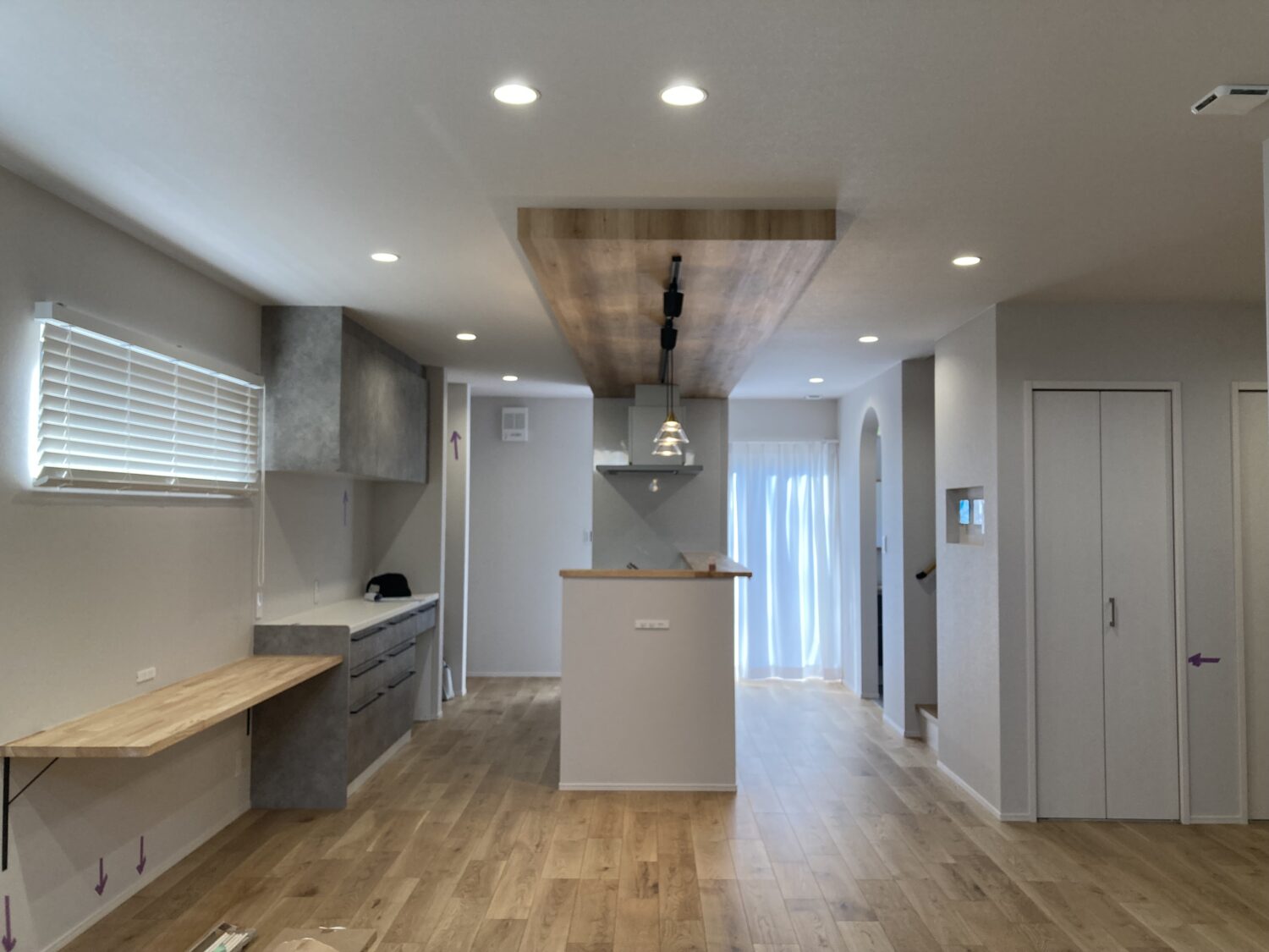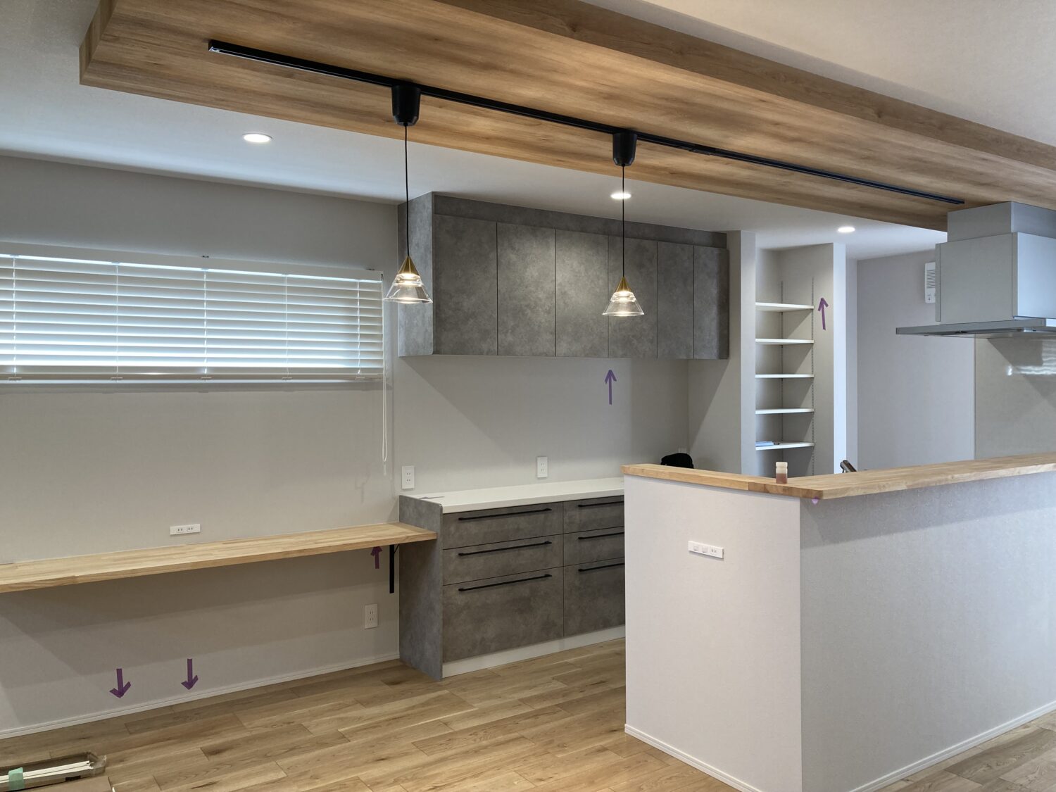 キッチン上の折下天井とペンダントライトが空間のアクセントになっています★