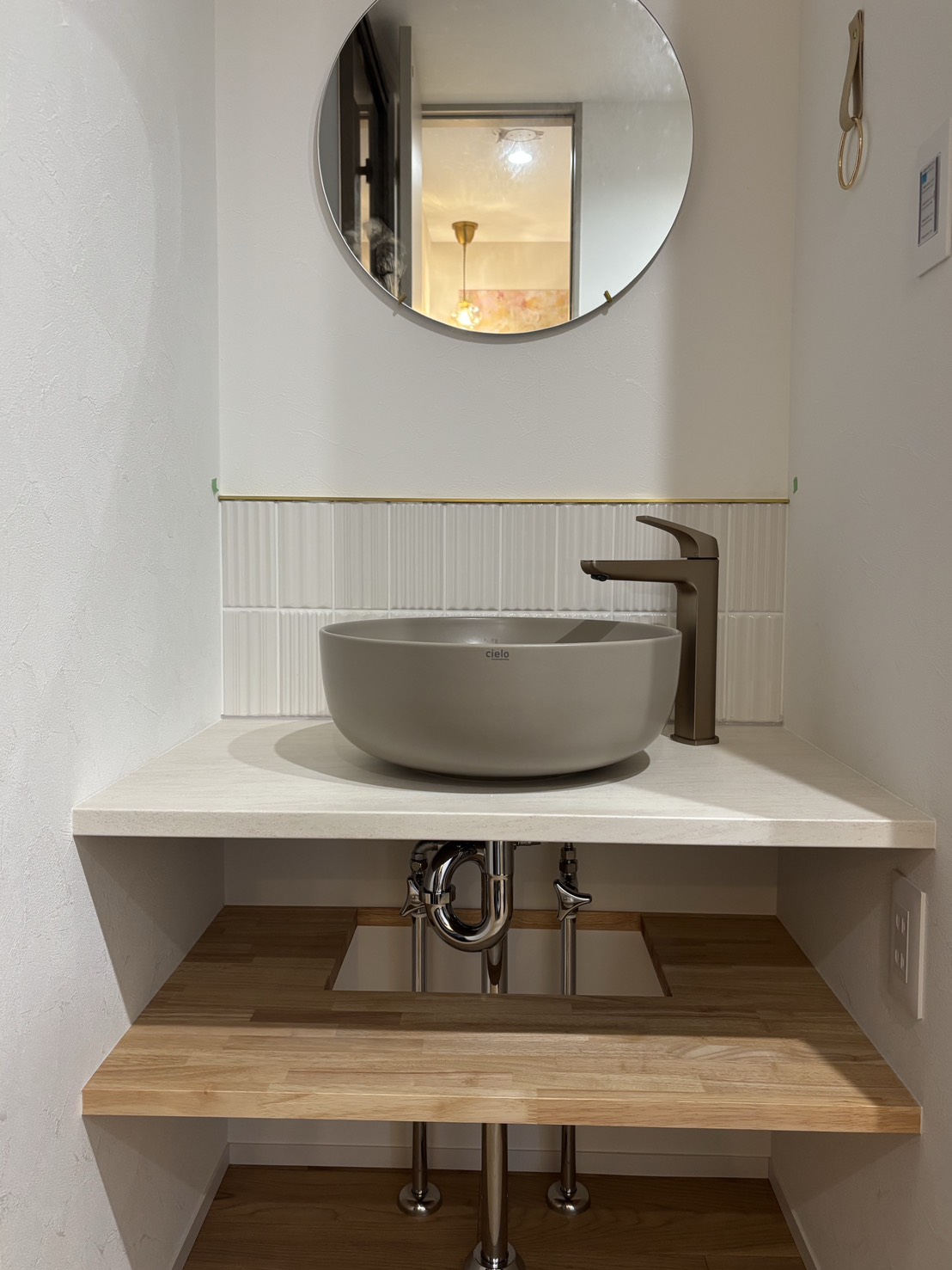 クロスとタイルのゴールドの見切りがアクセントになっており素敵です。