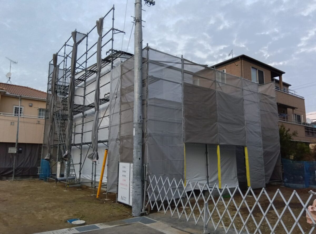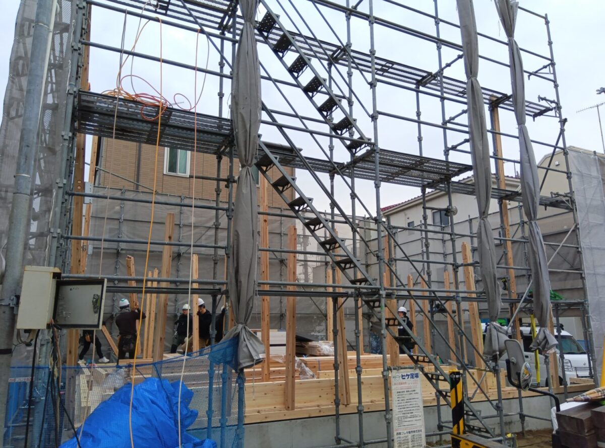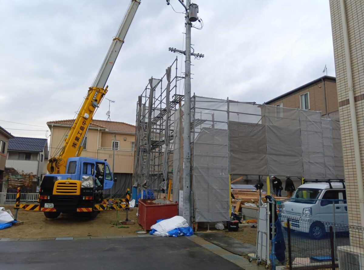 建物廻りをシートで覆い無事に上棟作業は終わりました