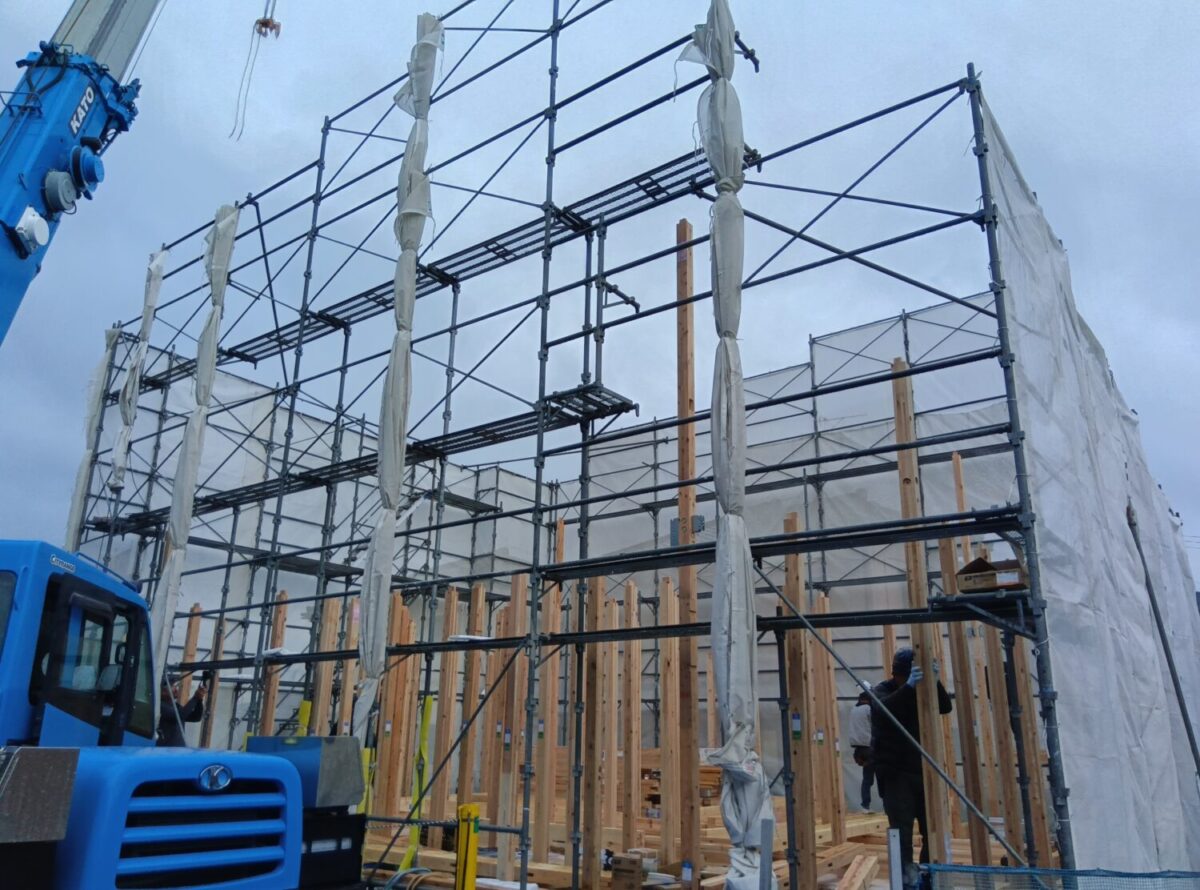 本日は大工さん6名とレッカーさん、私の計8名による上棟作業です。