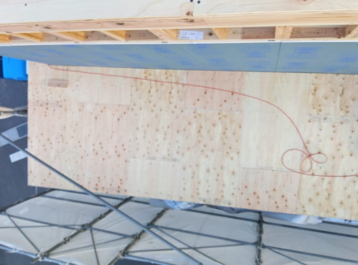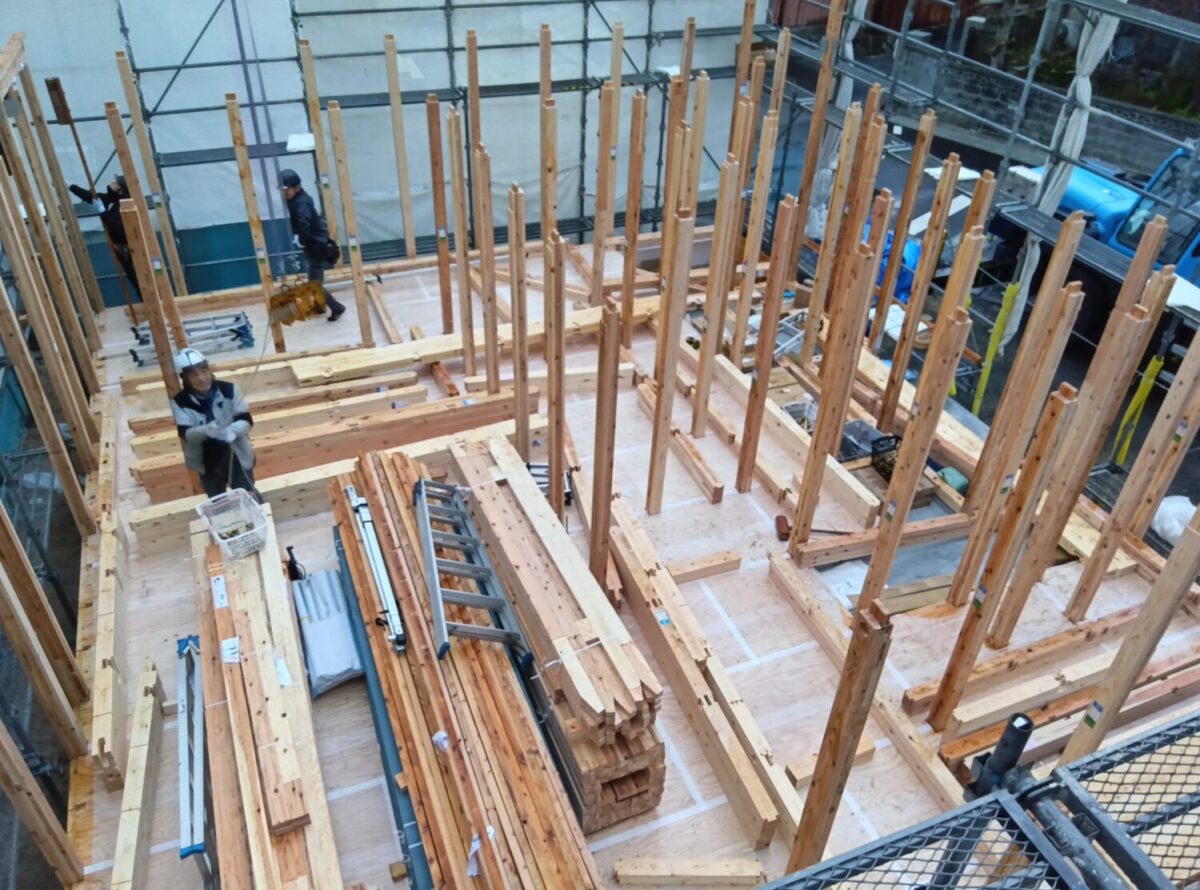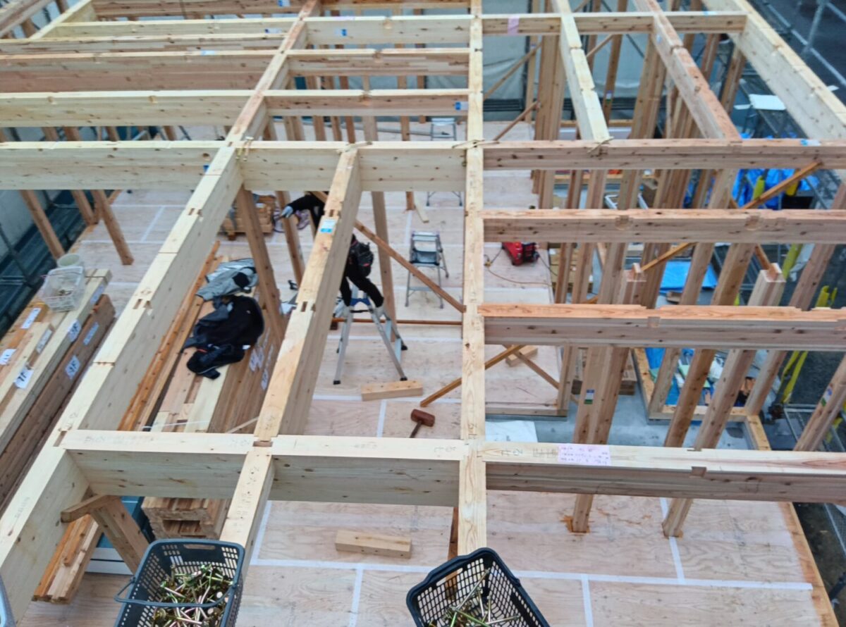 ある程度組みあがると1階全体の垂直確認と仮筋交いにて固定を行います。
