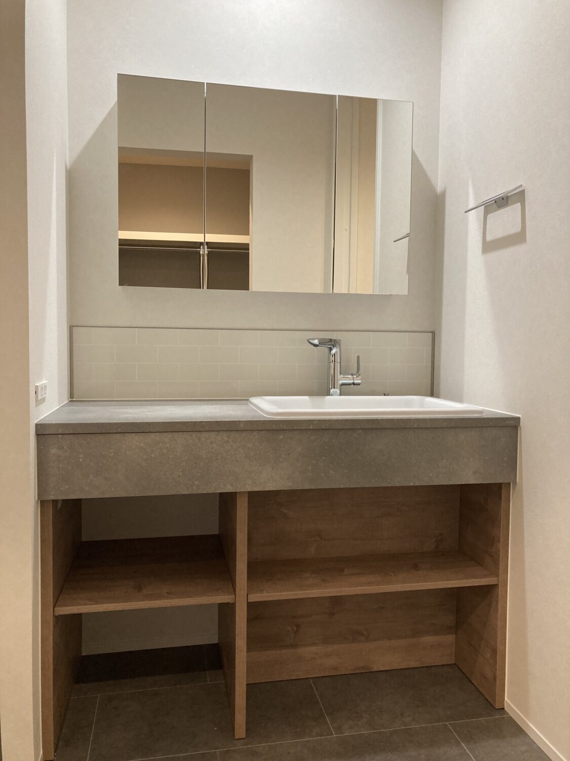 三面鏡裏やオープン収納により、見た目の美しさと実用性を両立しています。