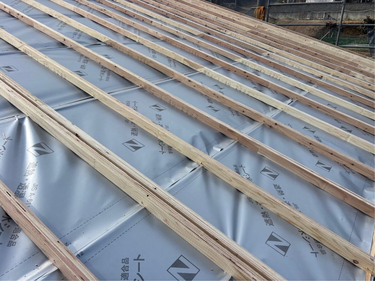遮熱・透湿・防水シートを施工し垂木を施工します。