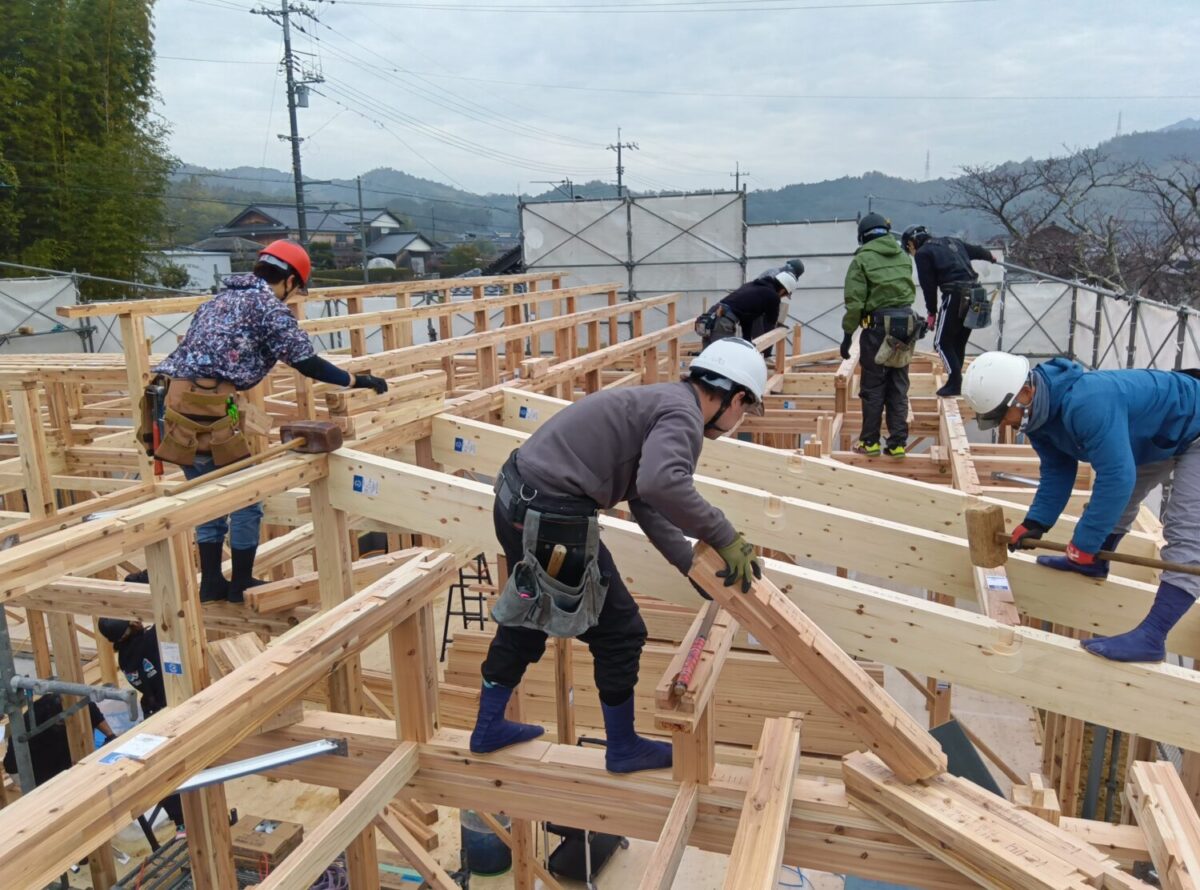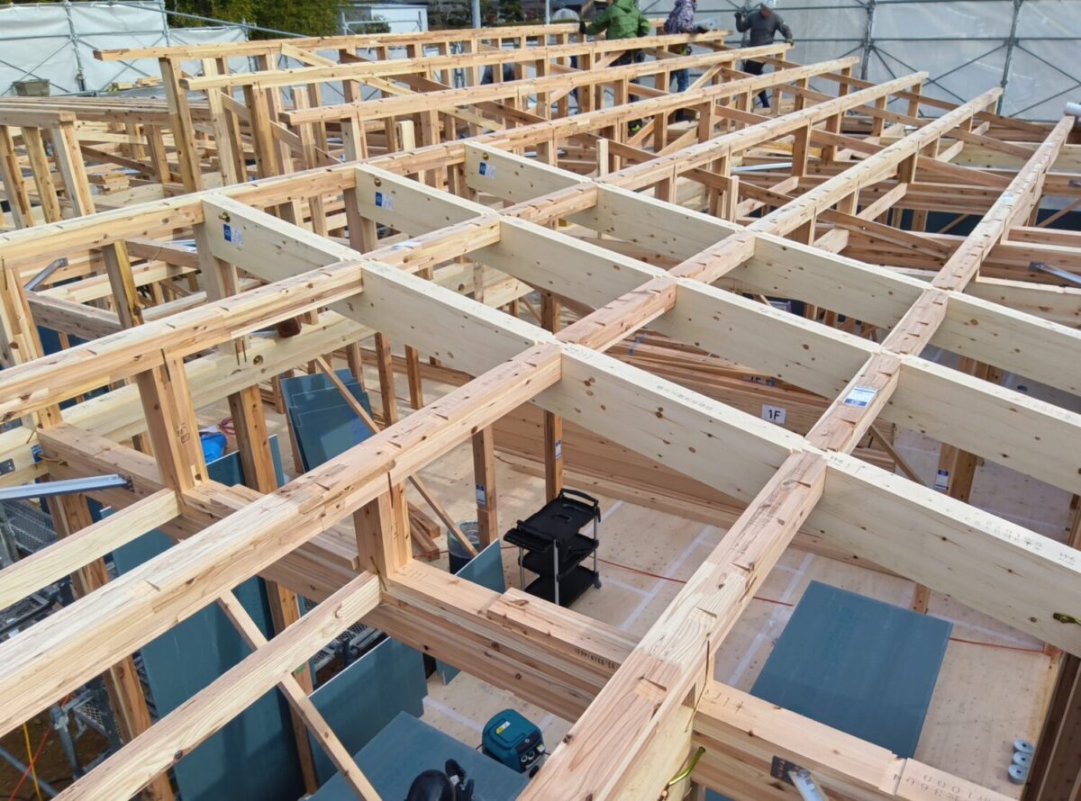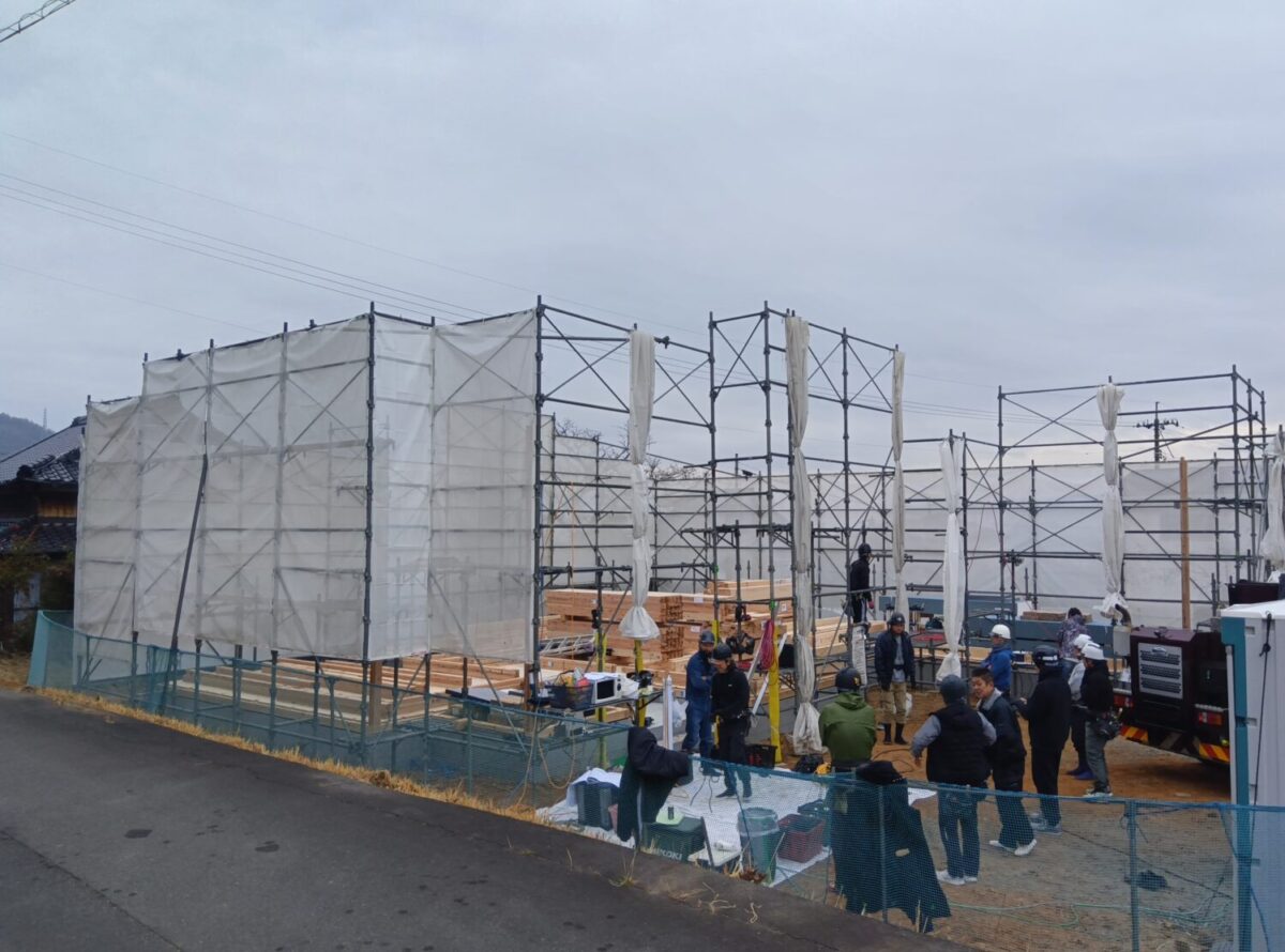 小屋組施工中。