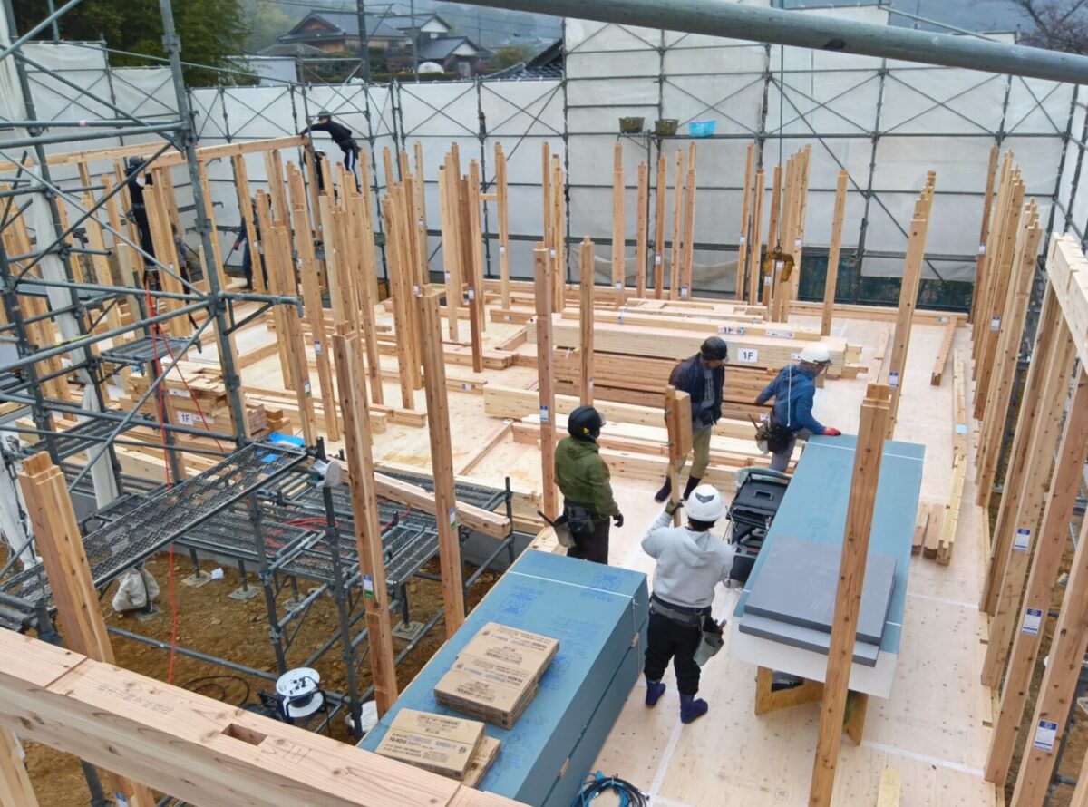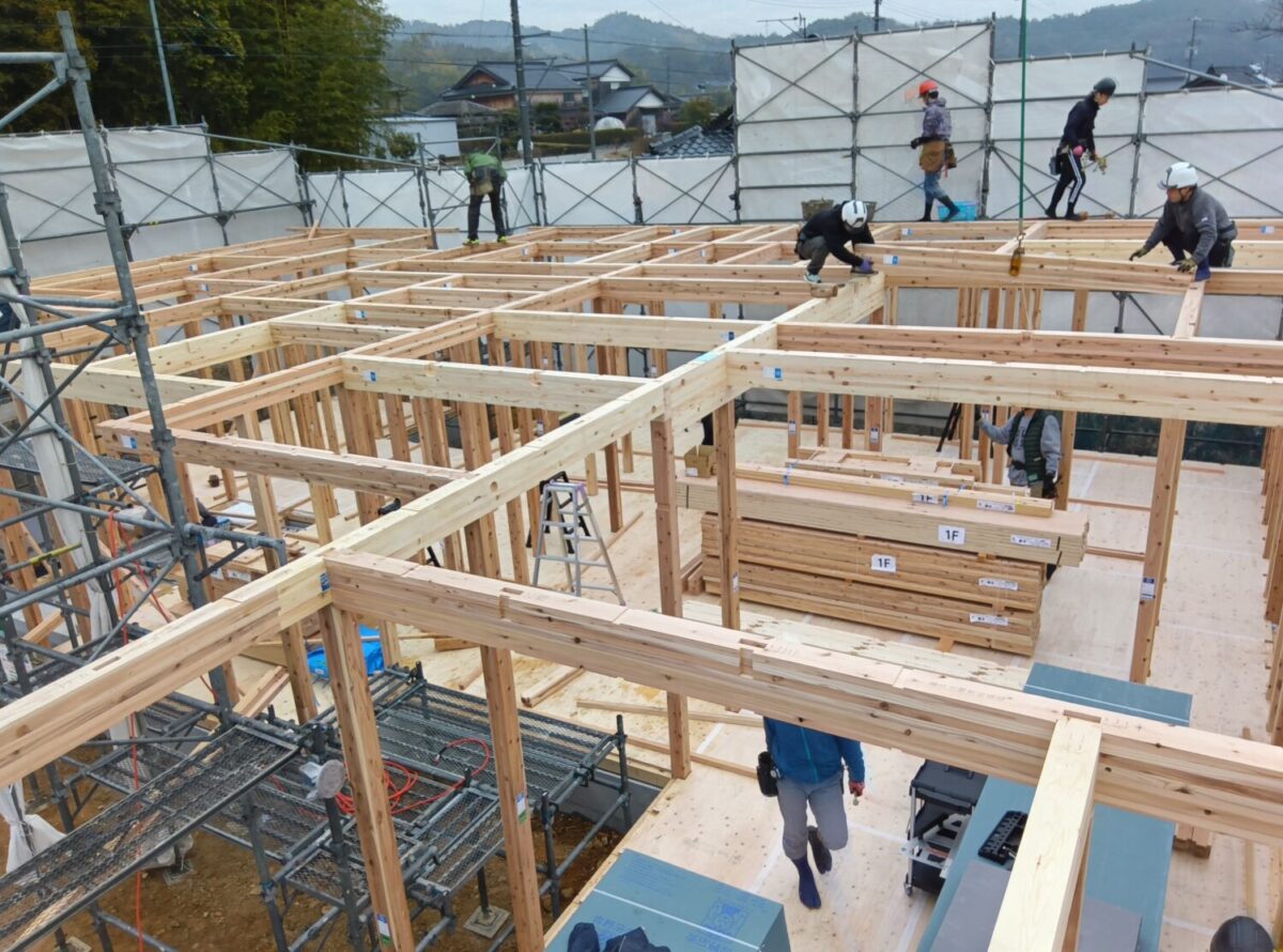 柱を建てて横架材を組み始めたところ。