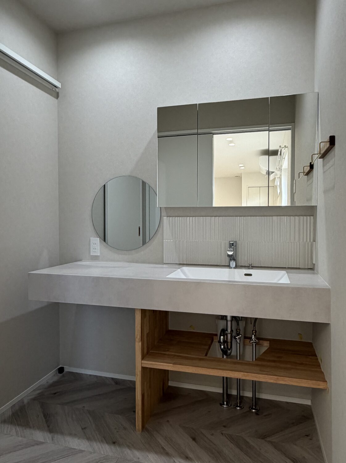 三面鏡裏の収納と洗面カウンター下の収納によって使いやすさと見た目の美しさを両立しています◎