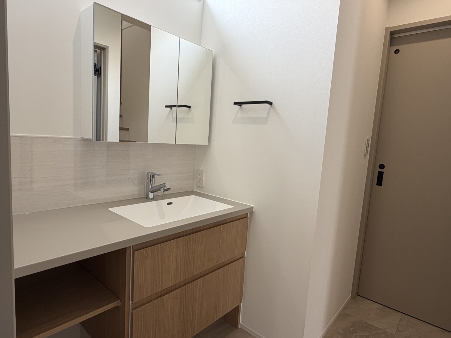 洗面台は木目とグレージュを組合わせ、やわからさの中に落ち着きを感じる仕上がりに♪