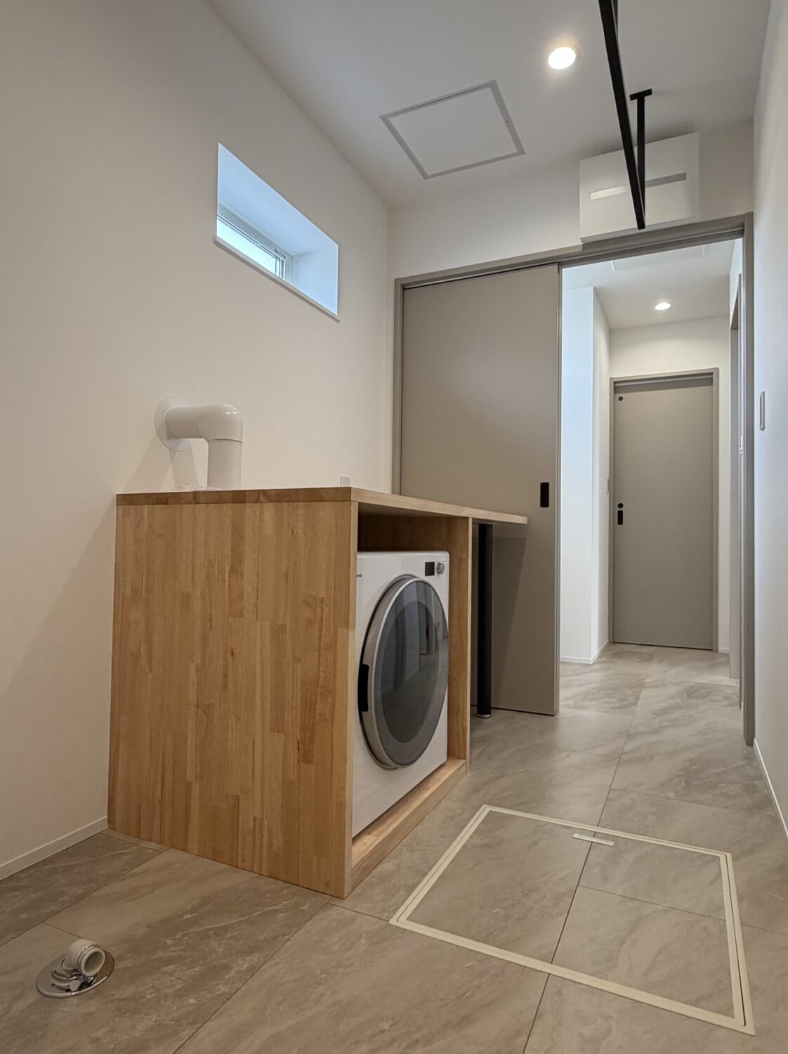ランドリースペースは造作カウンターを設け、乾太くんをすっきりと納めた設計に。