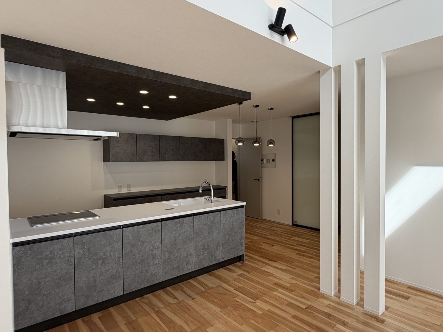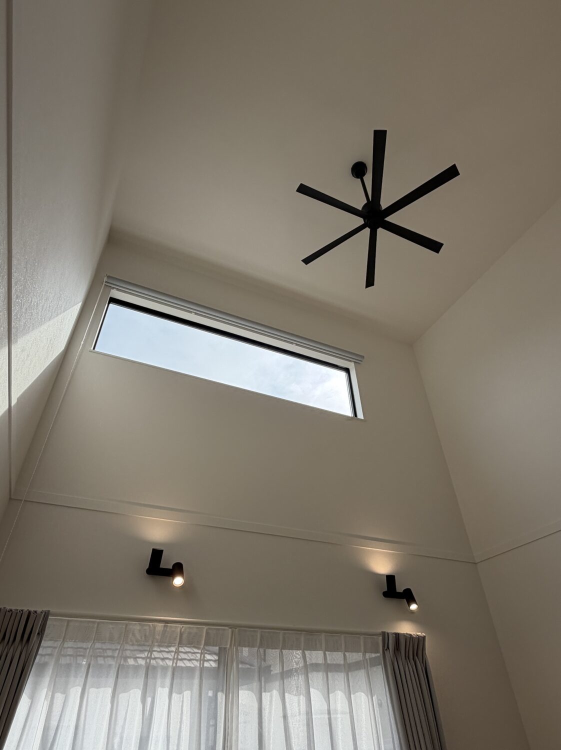 ブラックのシーリングファンやスポットライトがアクセントとなり、