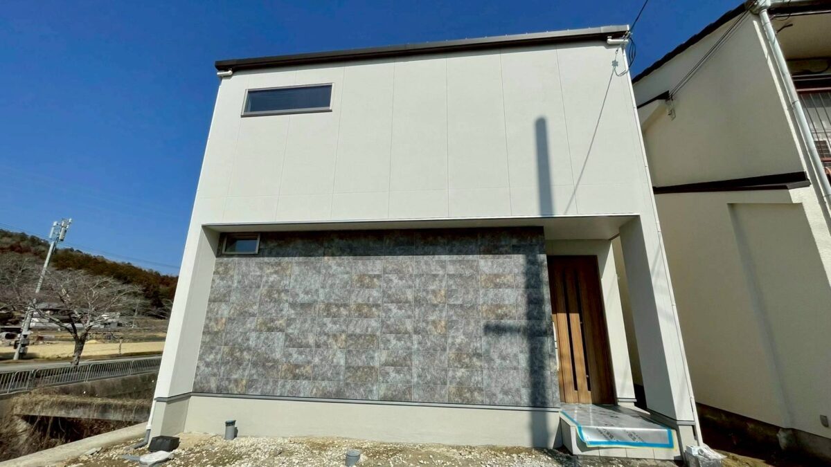 白を基調に、石目調のサイディングがアクセントになって上品な印象の外観です。