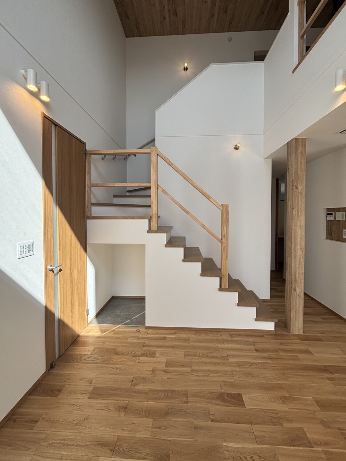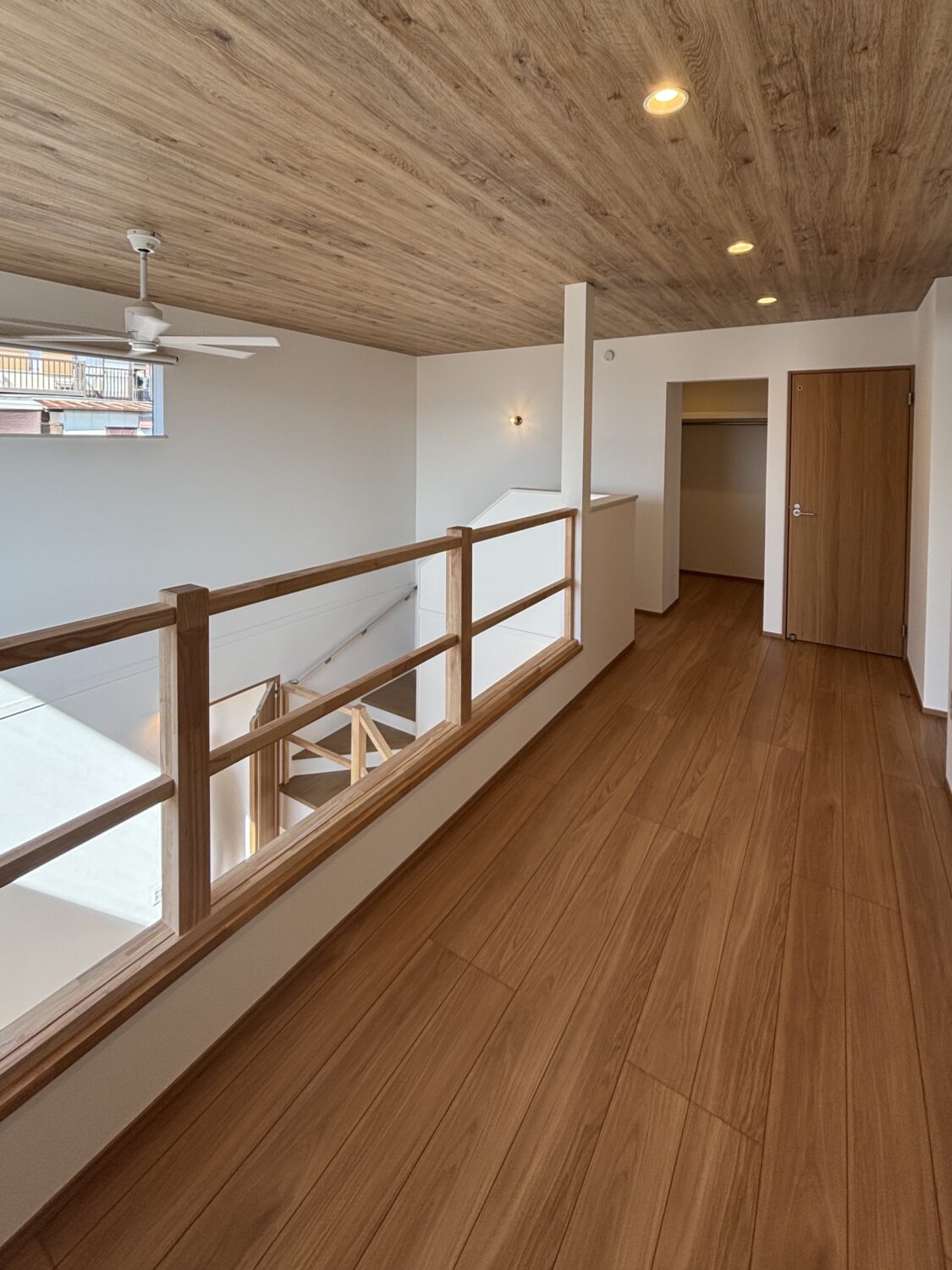 大きな吹き抜けと木製の手摺が印象的でした!ホワイトと木目でまとめられ、暖かみを感じる空間になりました。