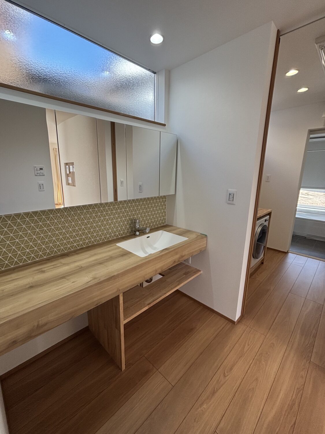 鏡の上と浴室に窓を設けることで、抜け感のある水回りになりました。浴室にこんなにも陽の光が射し込むと朝風呂をしたくなりますね(*^^)v