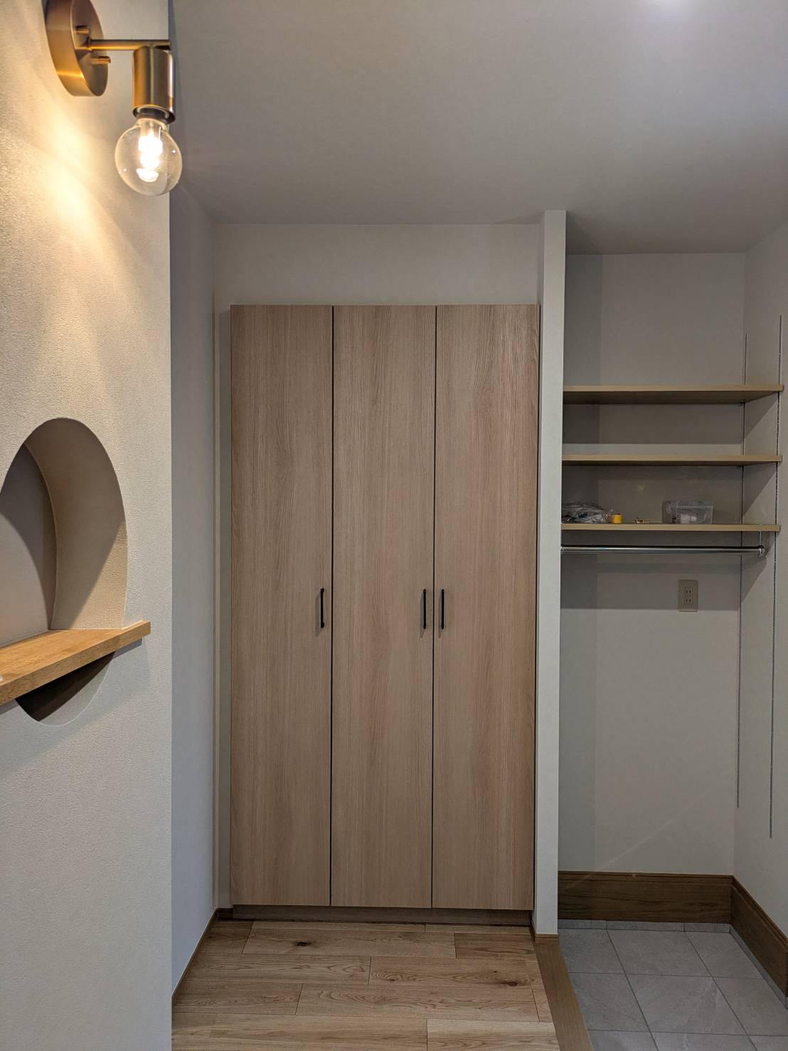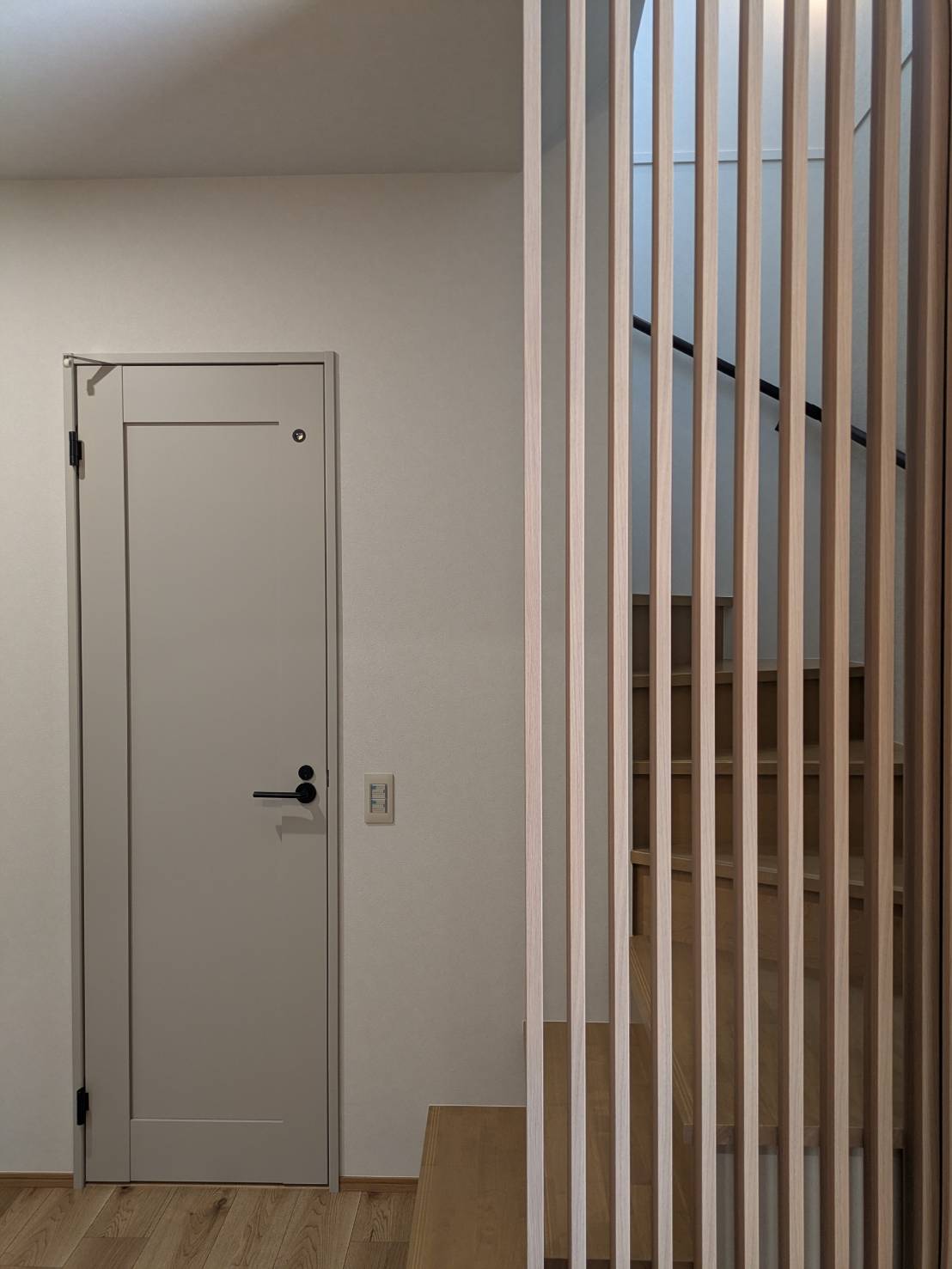 玄関には大容量のシューズボックスと土間収納スペース、階段の格子と丸型のニッチで和モダンな雰囲気に仕上がりました