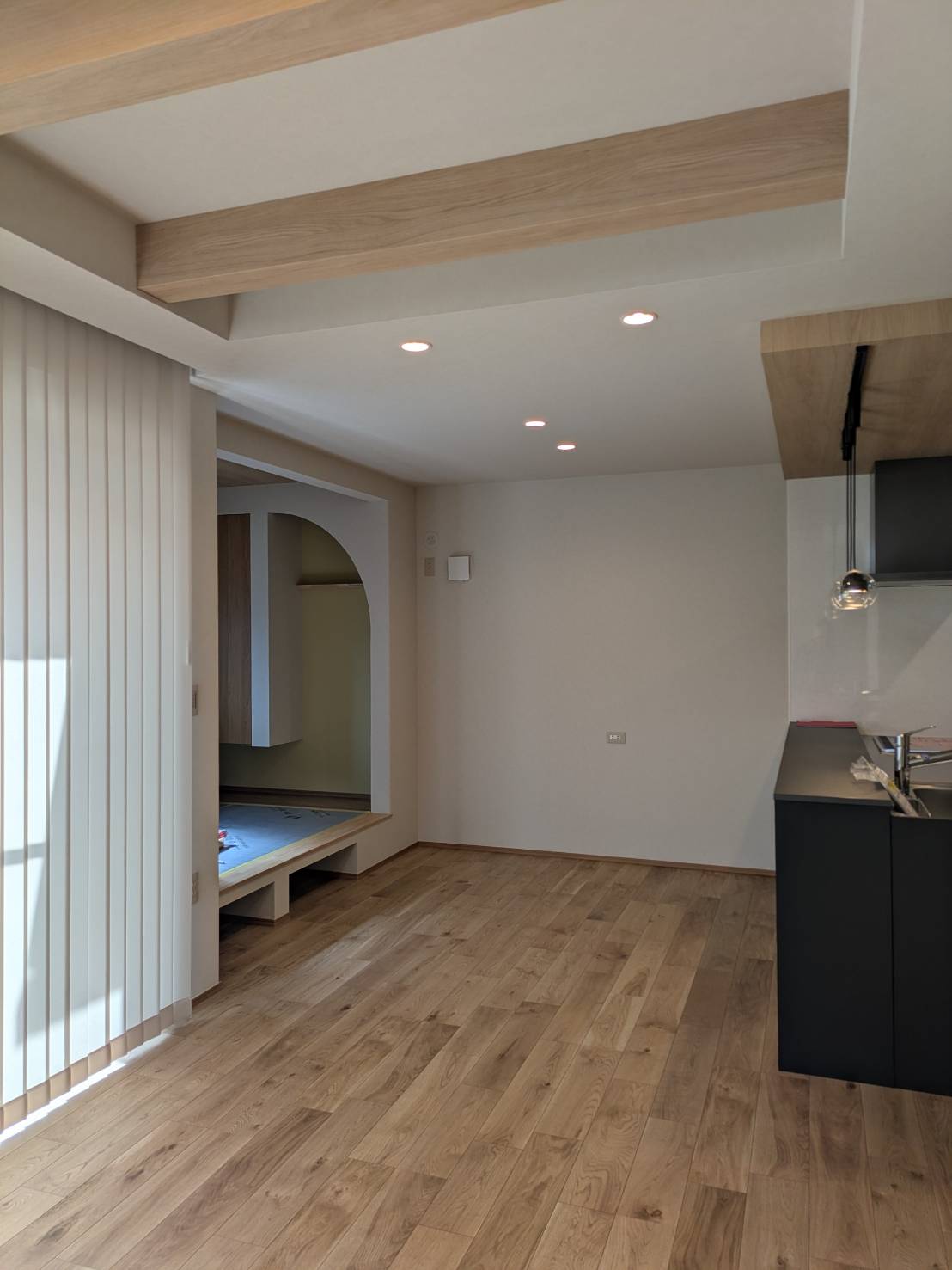小上がりの畳スペースのあるLDKはグレージュ・木目・グレーが調和した空間に仕上がっています